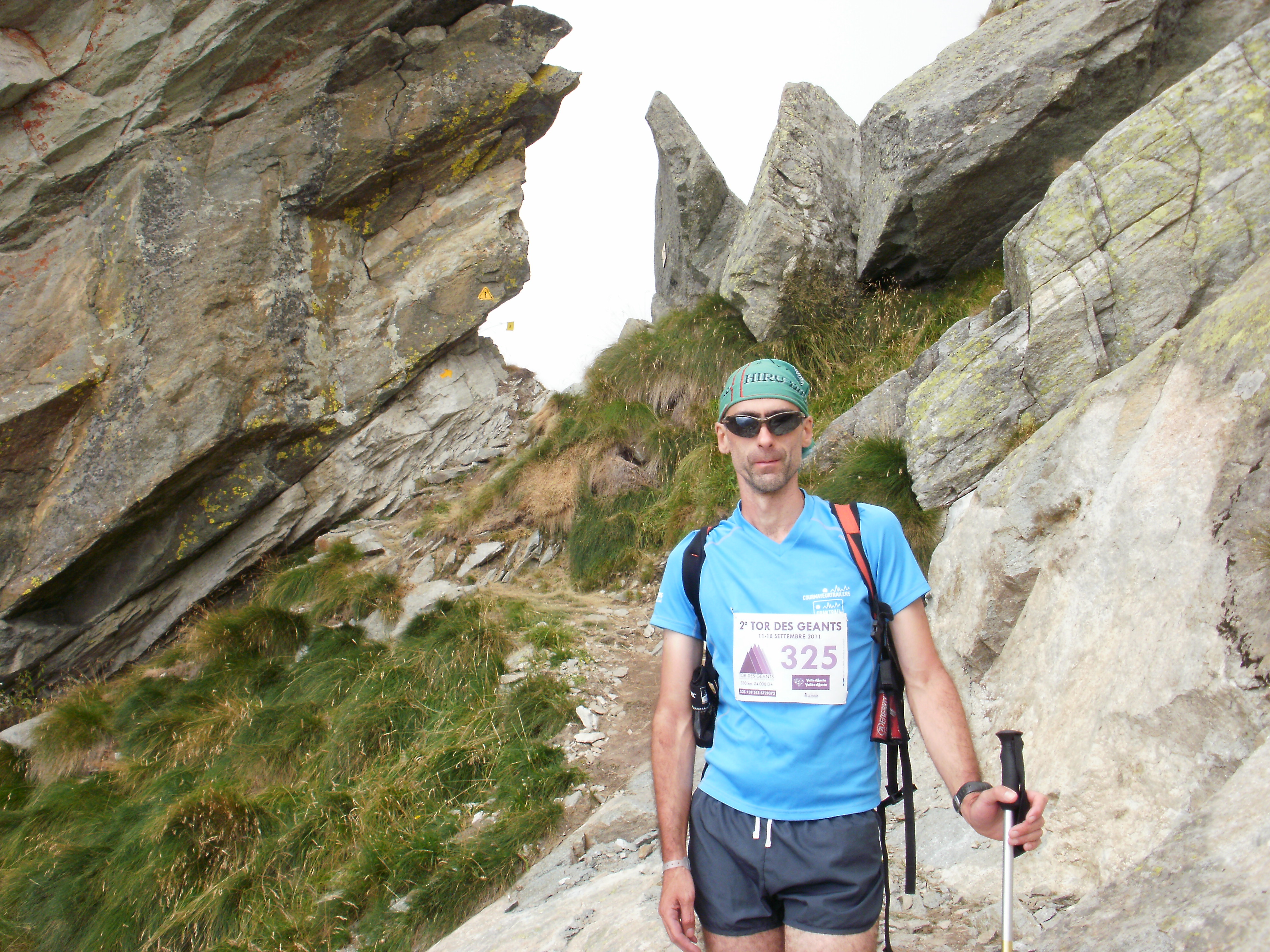 Iniciamos descenso. Se está nublando, lo que acrecienta la sensación de soledad. En un primer momento el camino nos lleva hacia la izquierda. Allá abajo se distingue un grupo de personas, pero no son de “los nuestros”. Llegados a un rellano, viramos decididamente a derechas, atravesamos una pedrera y avistamos la carpa del siguiente avituallamiento. Uno de los controles más simpáticos, hasta el punto de que hacemos “el dominguero” durante casi media hora, espatarrados en unas hamacas y disfrutando de la riquísima sopa que nos ofrecen. Felicitamos efusivamente a la hábil cocinera y Javier remata sacando la delicatessen, jamoncito rico que nos ofrece a todos. Un esfuerzo de voluntad, que hay que seguir, no nos sobra el tiempo y nos estamos aburguesando. Dejo bien claro que estén muy pendientes de Marc. Nos despedimos y partimos con buen humor a afrontar la siguiente subida, hasta el paso que se veía desde la Marmontana, la Crena di Lei. ¿Raro nombre, no? Roberta ya me había explicado la fascinante diversidad lingüística de este valle, en el que el aislamiento ha permitido que en aldeas separadas por poquísimos kilómetros se hablen cuatro idiomas: italiano, francés, alemán y valdostano. El tiempo se pone fosco. Un primer tramo en el bosque y enseguida salimos a terreno de prados. La subida no es demasiado larga y en el paso, literalmente un tajo en la roca, Javier me saca las que serán las dos últimas fotos con mi cámara. Soy muy vago para sacar fotos, y el cuarto día de carrera ya iba pensando en otras cosas.