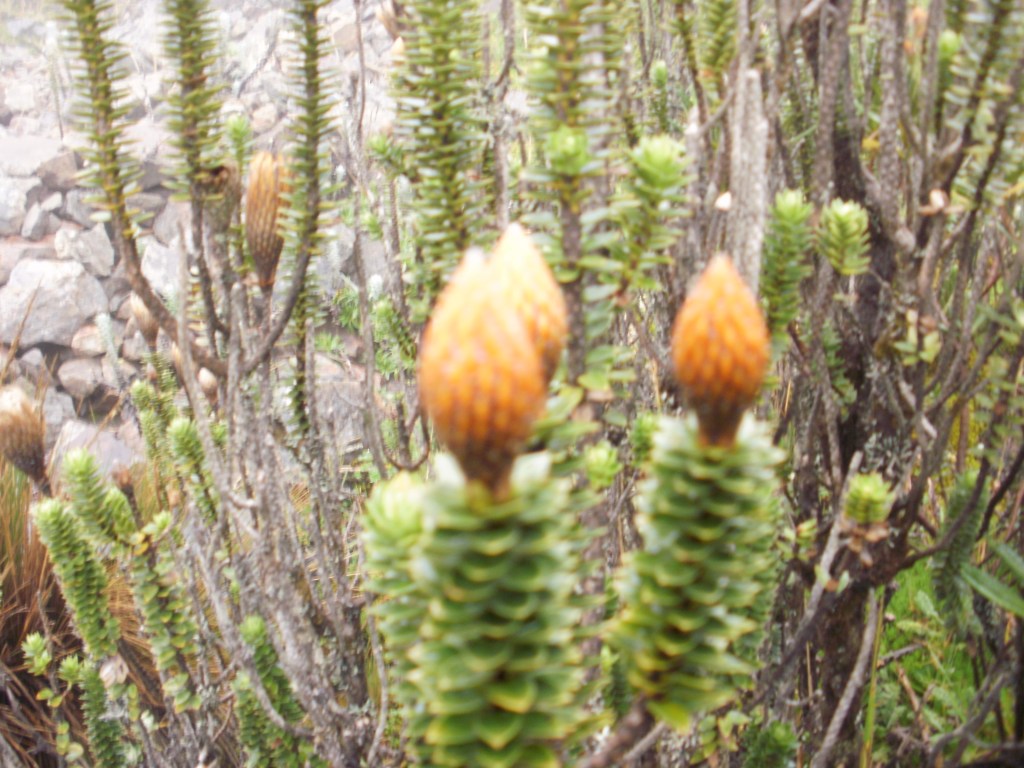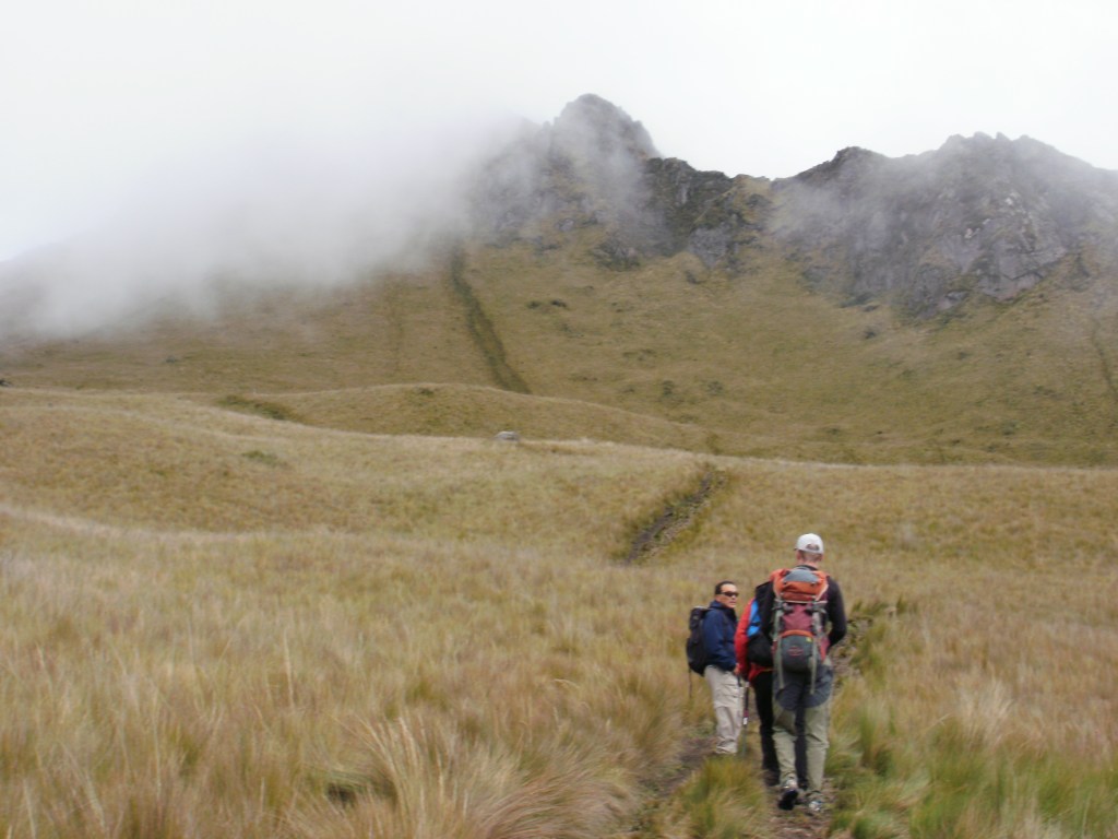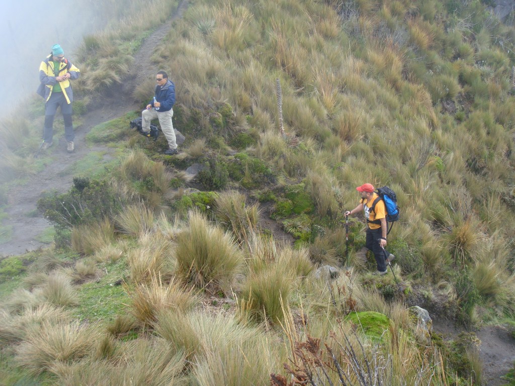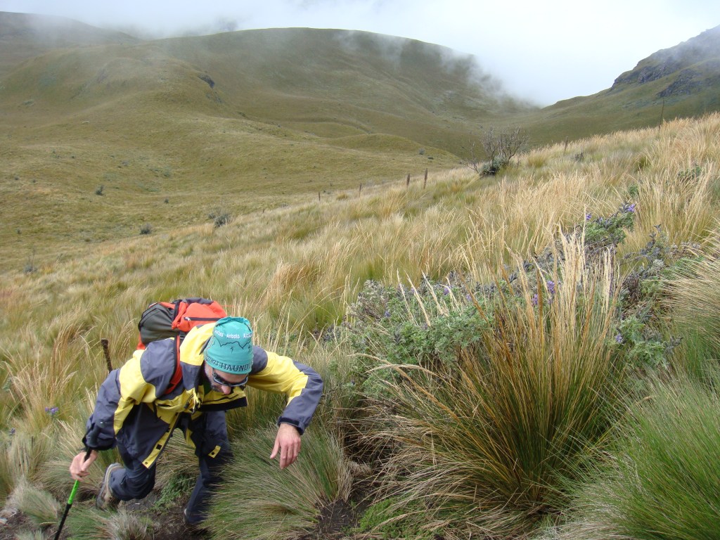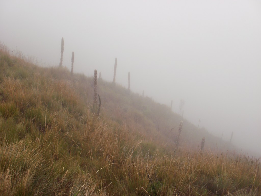 Escalamos una pendiente de hierbas altas. El páramo es un ecosistema muy sugerente, propio de los Andes húmedos de Colombia y Ecuador. Las bromeliáceas, como la achupalla, motean las laderas herbosas impregnadas por la niebla.