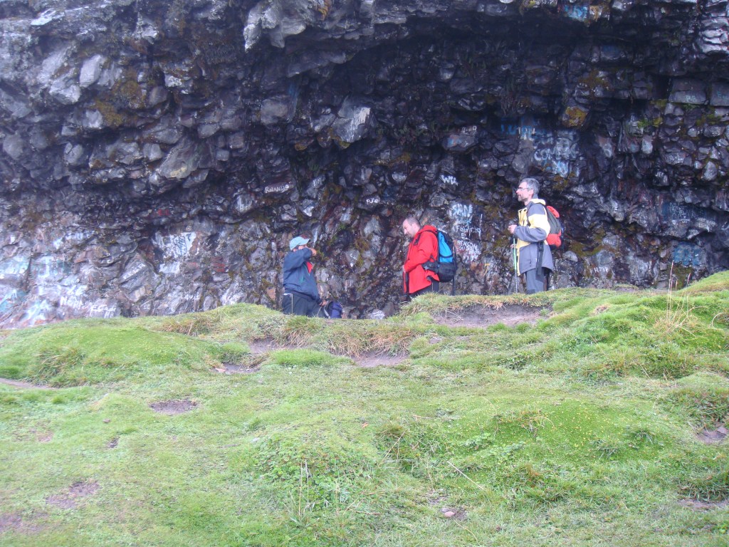 El Rucu Pichincha se nos aparece desde aquí como un espolón inexpugnable. Hay que darle la vuelta para atacarlo por detrás. Para ello el camino inicia un rodeo por la derecha, al tiempo que se estrecha y vuelve extremadamente resbaladizo. Nos vamos pegando a las paredes de oscura roca volcánica.