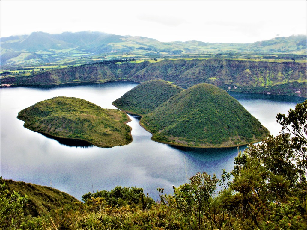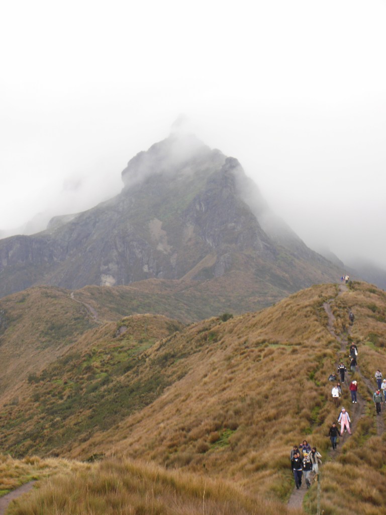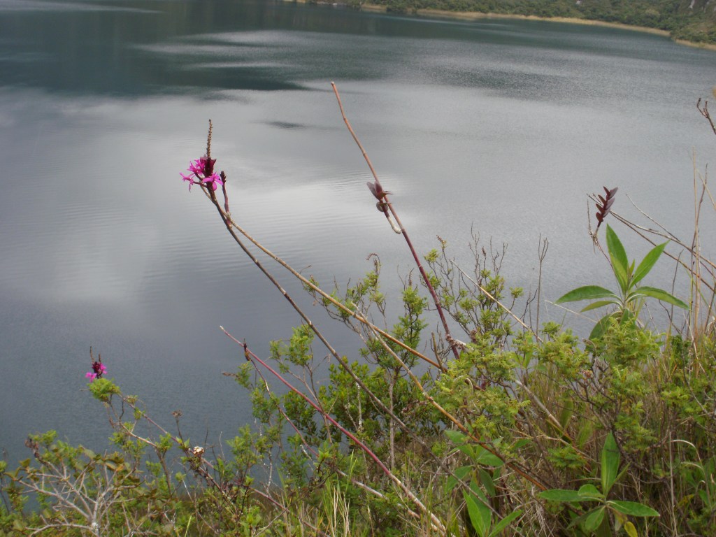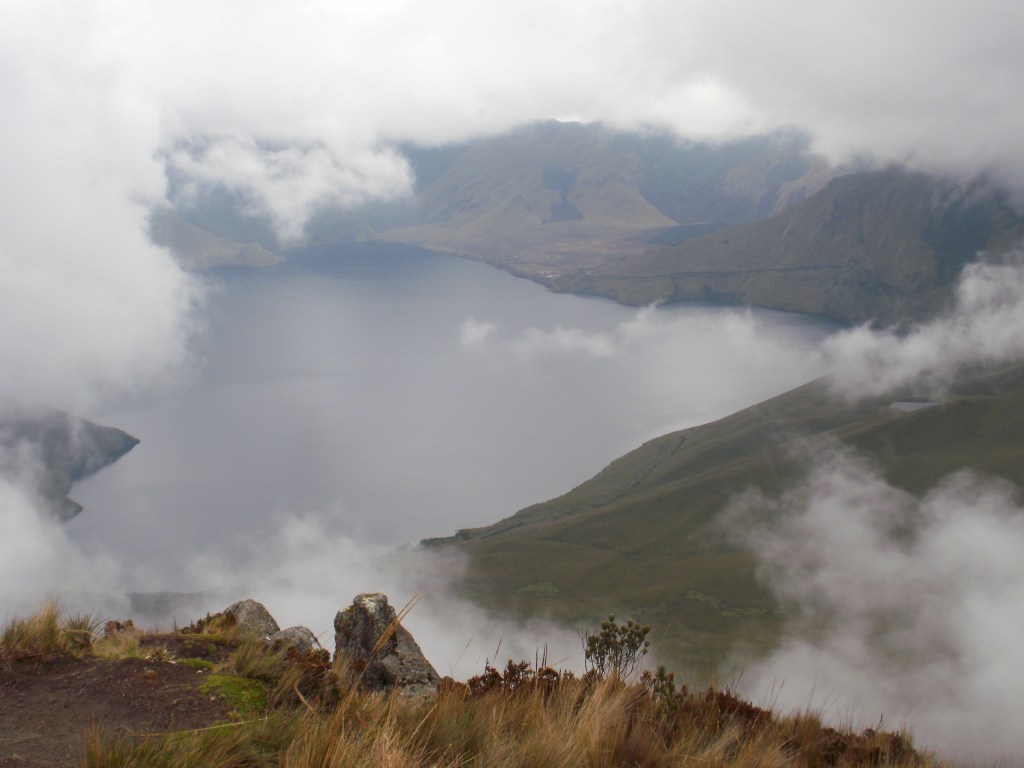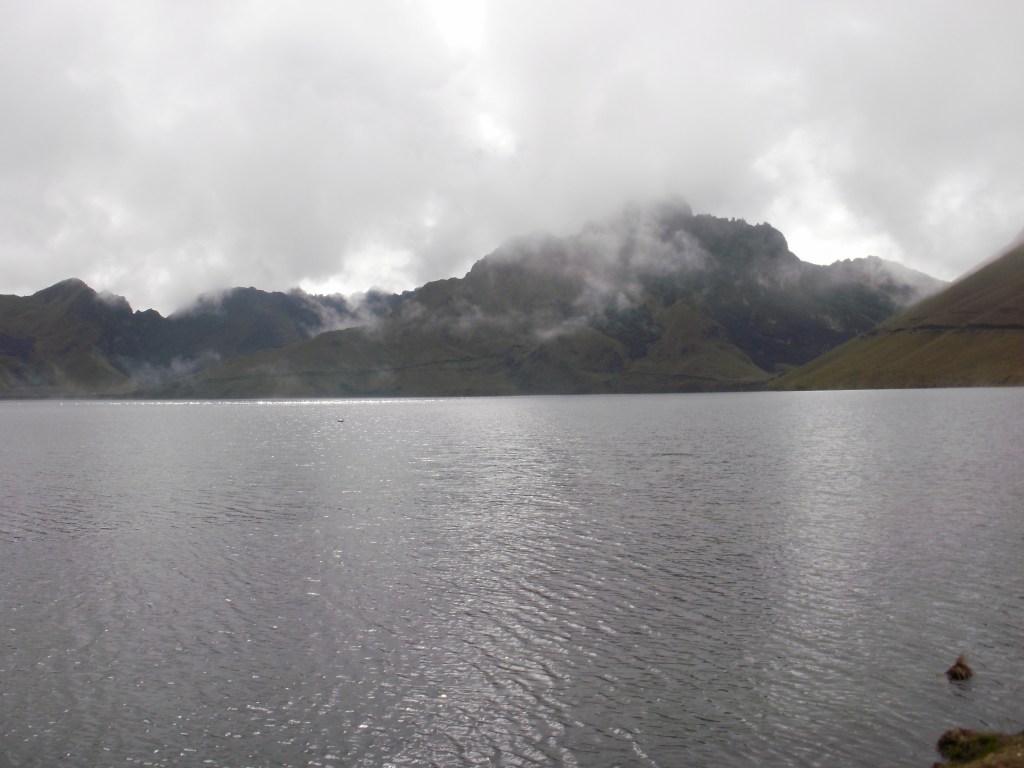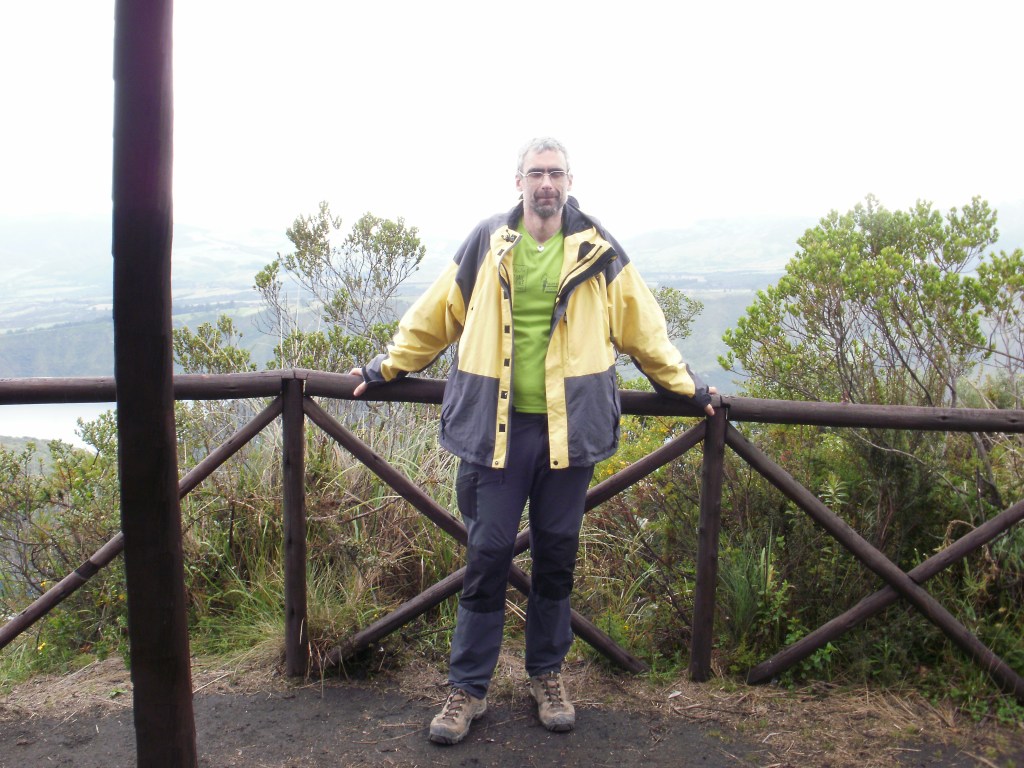 El 17 de Enero íbamos a estrenarnos en el aspecto deportivo, con un «paseo» alrededor de la Laguna Cuicocha (en quechua, cuicocha significa «laguna de los cuys», un roedor andino del tamaño de una marmota que ensartado y a la brasa, es un manjar muy apreciado en Ecuador). Desde Quito cogimos la carretera hacia el Norte, pasamos por Otavalo y accedimos al Centro de Visitantes del Parque Natural Cotacachi, al pie del volcán que le da nombre, así como a la ciudad homónima a sus pies. La Laguna Cuicocha es una caldera volcánica, producto de una erupción hace 3100 años, que se rellenó con agua, salvo por cuatro promontorios lávicos que formaron dos islas. La vegetación es exhuberante, el oso de anteojos medra por aquí, y, como muestro en la foto, el paraje es feo, feo.