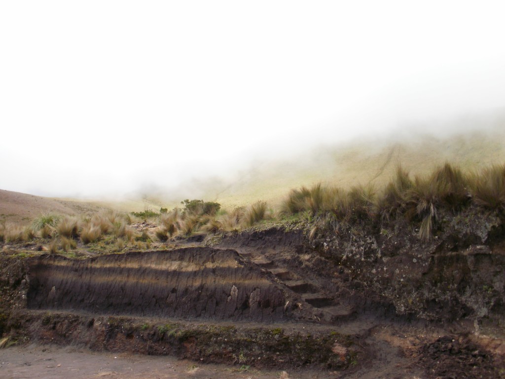 Al día siguiente nos esperaba la primera escalada propiamente dicha de nuestro viaje, el Fuya Fuya, una modesta montaña de apenas 4300 m de altura. En los Alpes estaríamos ante una mole glaciar, sobre la Avenida de los Volcanes de Ecuador, y a sólo un cuarto de grado al norte de la línea equinoccial, la dimensión cambia completamente. El punto de partida se sitúa en el impresionante paraje de la Laguna de Mojanda, adonde llegamos gracias a una carretera adoquinada en regular estado que parte de la Panamericana pocos kilómetros al sur de Otavalo. Atravesamos cultivos y bosques hasta llegar a la laguna, un inmenso cráter producto de la monumental explosión de dos volcanes hace unos 200.000 años, poco antes del colapso parcial del propio volcán Fuya Fuya. Es un paraje protegido y extremadamente sugerente, sobre todo cuando las nubes se agarran a las laderas de la corona de montañas que la rodean. Como sucedió el día de nuestra visita…