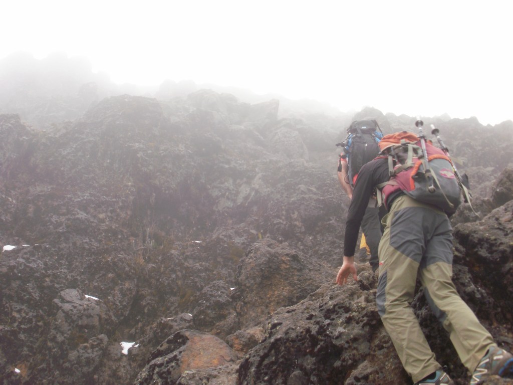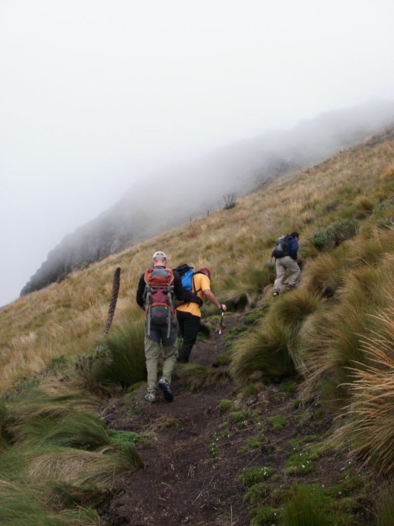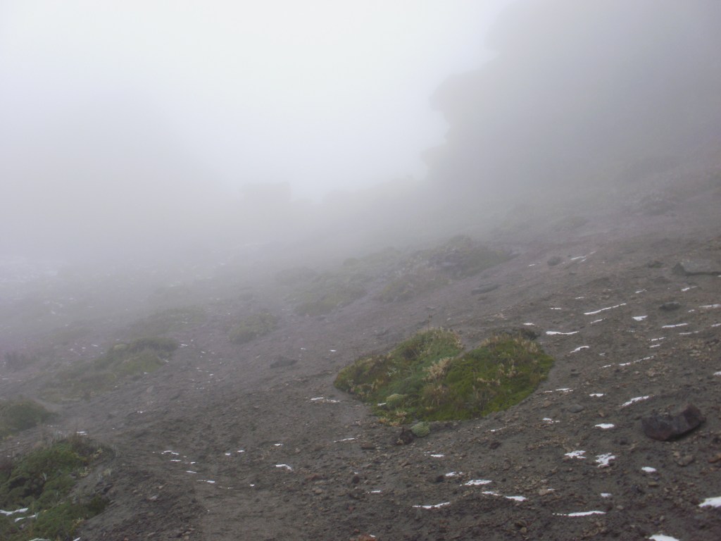 Al igual que el día anterior, la niebla nos impide ver la cumbre a la que nos dirigimos. El camino se encuentra muy bien marcado, la anchura es casi de trinchera…