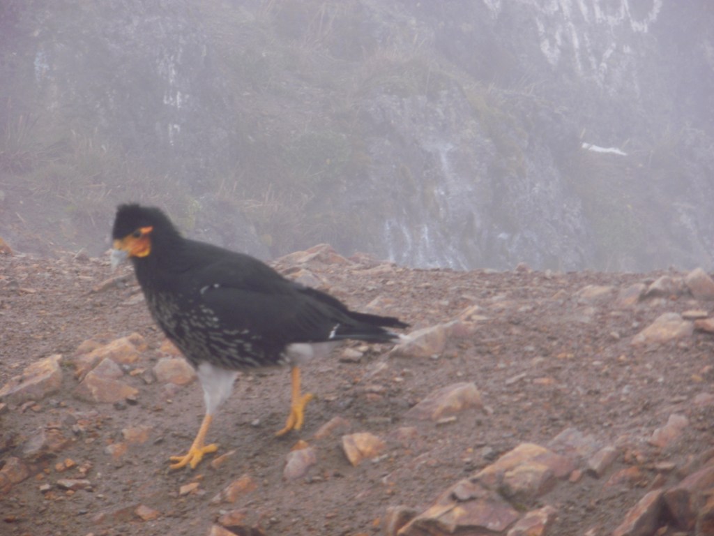 La niebla cerrada nos quita todas las vistas, pero encontramos un montañero que nos hace la foto de cima a los cuatro juntos. Un ave, acostumbrada a la presencia humana, también nos hace compañía, esperando que le caiga algo de nuestro almuerzo.