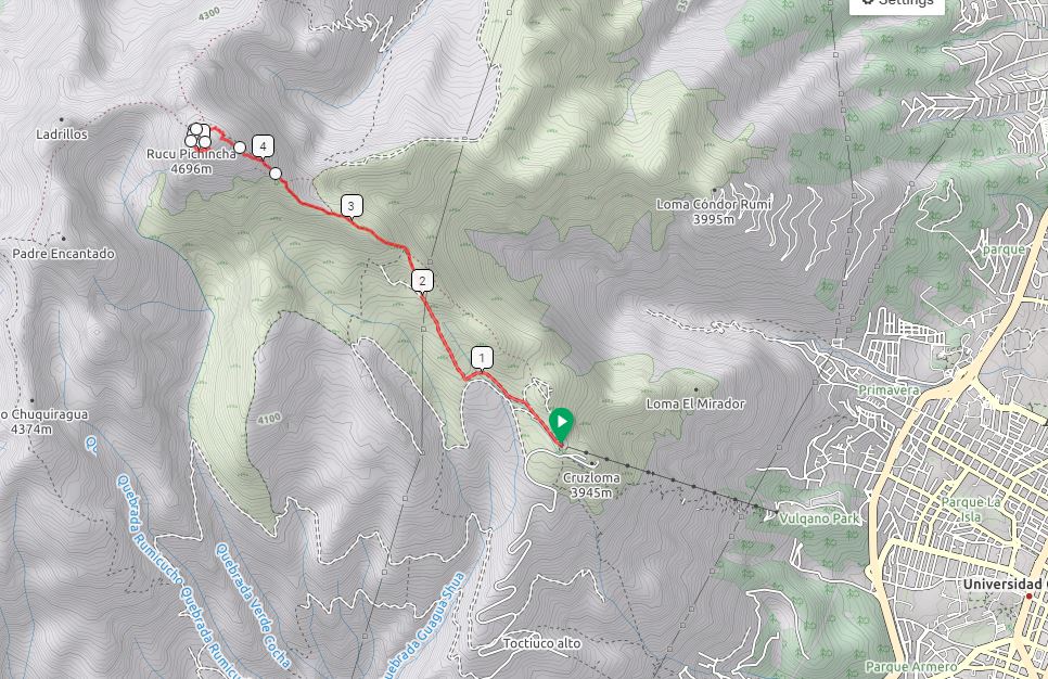 El inicio de la excursión se sitúa en la estación superior del teleférico Pichincha, que nos deja a casi 4000 m y con un desnivel restante de sólo 700 m hasta la cima. Sin embargo hay que remarcar algo importante. Los barrios cercanos a la base del teleférico no son muy recomendables, pero sobre todo hay que evitar aventurarse por la carretera que conduce a la estación superior, por Rucu. Aquí hay peligro real de sufrir un asalto, así que no merece la pena jugársela por querer ahorrarse el precio del billete.