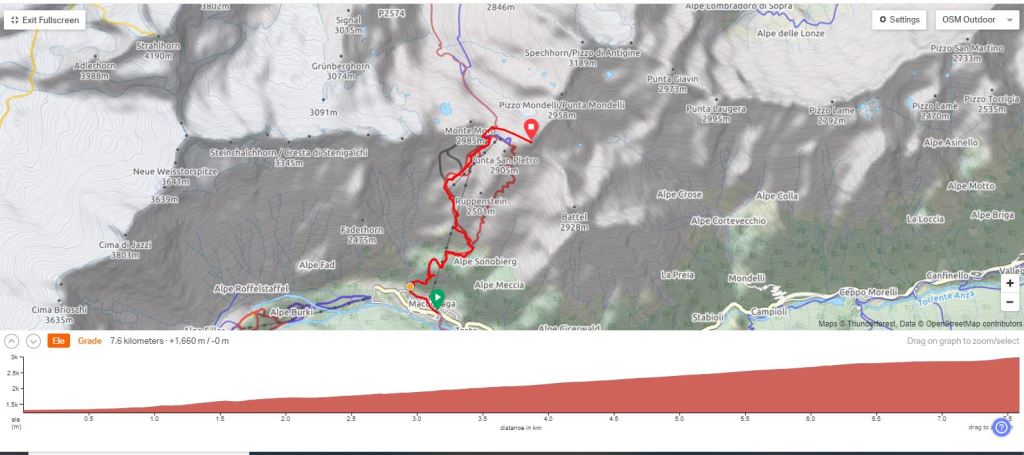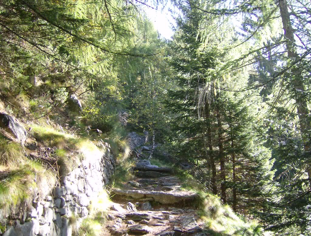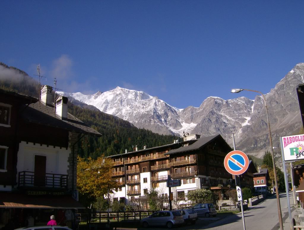 La llanura padana está nublada hasta la entrada al valle del Ossola. Cojo la carretera hacia Macugnaga, y a media subida el cielo se abre y luce el sol. ¡Qué gozada! Llego a Macugnaga, y aunque estamos en temporada baja, entre la de alpinismo y la de esquí, hay bastante animación. Comienzo a caminar buscando el arranque del sendero, que debería estar bien señalizado.