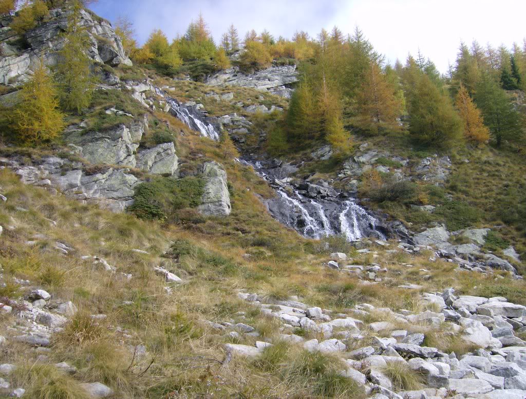 Vamos pasando por varios miradores sobre el pueblo hasta llegar al Alpe Brill, a 1700 m, estación intermedia del teleférico. A partir de aquí la altura se va dejando notar y el bosque se hace más rado. Llegamos a una especie de circo en cuyo fondo varios torrentes caen por las paredes rocosas. El Llegamos hasta estas paredes y torcemos a la izquierda. El bosque está precioso con los colores de otoño.