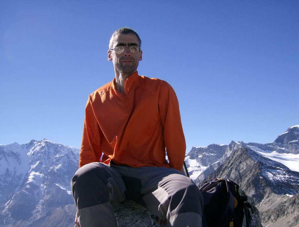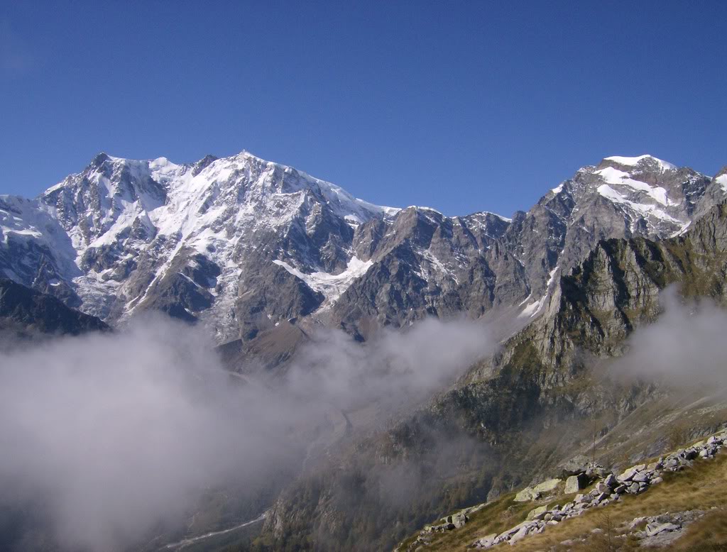 2007 había sido un gran año montañero para mí. Había caído finalmente el Mont Blanc, por la normal de Goûter, después de dos años en que los elementos se conjuraron para impedirnos el acceso por la grandiosa vertiente italiana. En septiembre había sido el turno del Castor y los Breithorn Occidental y Central, en solitario subiendo desde Cervinia. En Octubre volví mis ojos hacia un objetivo técnicamente más simple, el Joderhorn, en la cresta fronteriza italiana-suiza, que prometía unas vistas privilegiadas del Monte Rosa y de los cuatromiles del Valais suizo. Salvo los últimos 200 m, la ruta discurría por el excelente sendero que comunica Macugnaga con Saas Almagell a través del Paso de Monte Moro (2864 m), y que forma parte del Tour del Monte Rosa. Eso sí, el desnivel, 1700 m en apenas 8 km, no era ninguna broma. Pero había que aprovechar el buen estado de forma del verano…