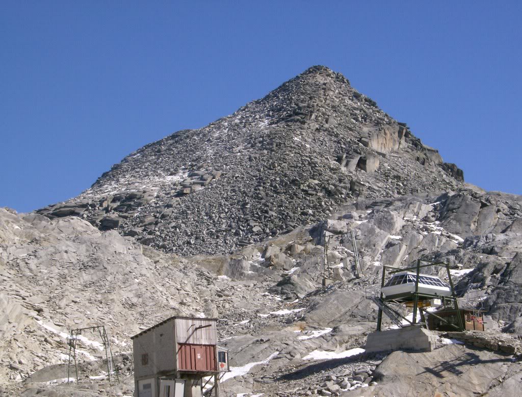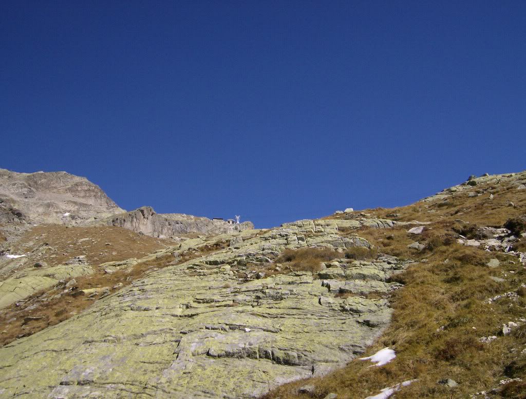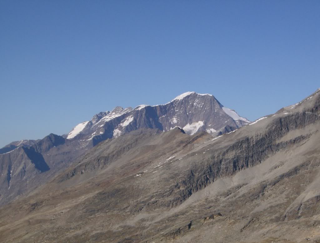 A las tres y cuarto, después de comer y descansar gozando de la montaña como pocas veces, tiro para abajo, con mucha calma. Retorno al refugio y decido subir de propina el Monte Moro, que se encuentra justo al oeste del Paso. Tiene unas pendientes de roca suelta bastante interesantes, más complicadas que las del Joderhorn, y con alguna vira expuesta. Este es su aspecto desde el Paso.