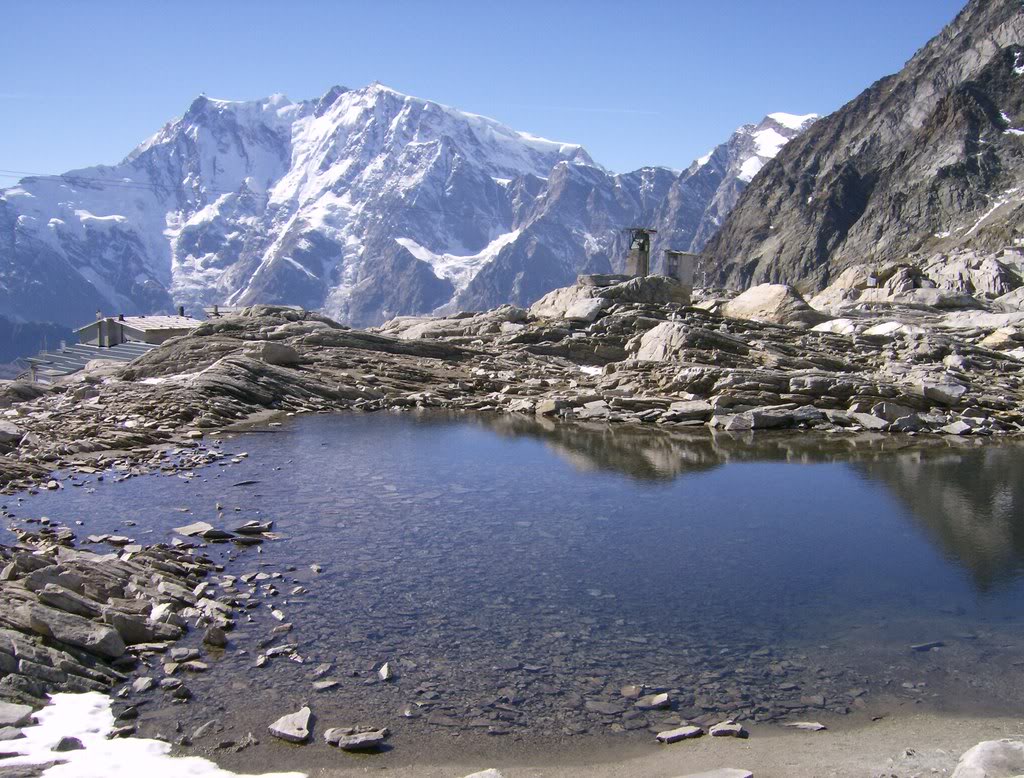 El terreno se vuelve caótico y debo avanzar entre grandes bloques morrénicos. A veces encuentro charcas de deshielo.