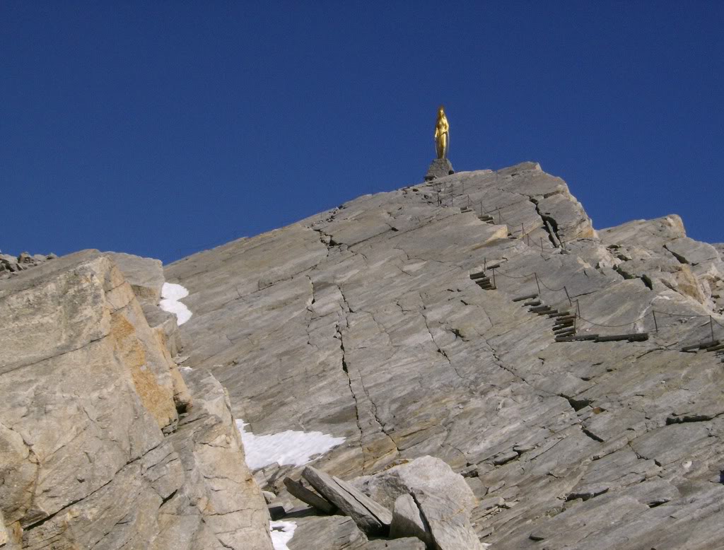 Podría acercarme desde aquí, pero prefiero continuar subiendo un poco más para alcanzar la cresta fronteriza en el Paso Monte Moro, coronado por una gran estatua dorada de la Madonna. Hasta ahí se llega por unas lajas lisas en las que han instalado travesaños de madera a modo de peldaños y cadenas. Este paso debió tener mucha importancia en tiempos como vía de comunicación entre el Valais suizo y los valles italianos.