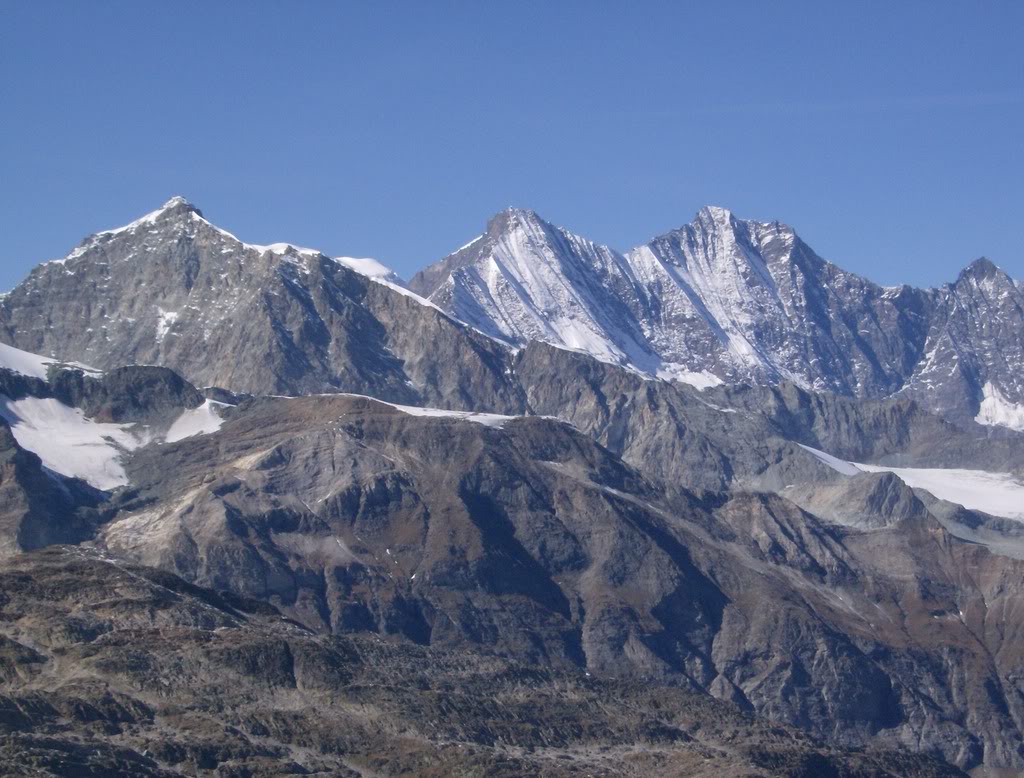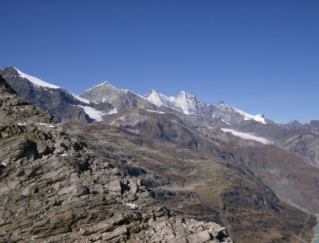 Esto hacia el oeste, ya nos suena de antes. El Stralhorn (4190 m) y justo detrás, semioculta, la cúpula nevada del Allalinhorn (4027 m), ambos estuvieron entre mis primeros cuatromiles; a su derecha el magnífico dúo Taschhorn (4491 m) – Dom (4545 m), este último también conquistado, hacía tres años.
