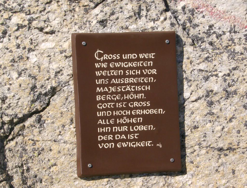 La Virgen no es el único símbolo religioso que encuentro en el collado. También hay una placa con una oración en alemán. Google viene en mi ayuda: «Grandes y anchos mundos como la eternidad se extienden ante nosotros, altivas montañas majestuosas. Dios es grande y loado, todos lo exaltan solo para alabarlo, que está ahí desde la eternidad». Las montañas no son un mundo mineral ajeno al hombre. El ser humano ha vivido en ellas, las ha temido y las ha admirado. Y todas las culturas, en todos los tiempos, las han vinculado de un modo u otro con los dioses, con la trascendencia. Hay quien opina que hay que retirar la simbología religiosa de cumbres y collados, en nombre de una «tolerancia» o de un conservacionismo mal entendidos. Estos símbolos no imponen creencias, sino que son testigos de la cultura y de la historia de los hombres y mujeres que han vivido en las montañas, con las montañas. Sea una cruz cristiana, un altar budista o una apacheta incaica, su desaparición significaría la pérdida de un pedazo de humanidad. Lo cual no significa, naturalmente, que haya que llenar la montaña de ferralla conmemorativa indiscriminadamente y sin criterio.
