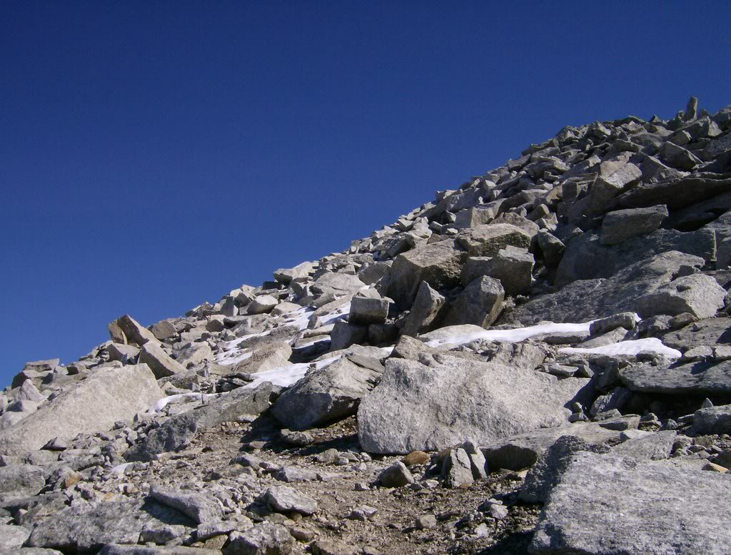 Hay algunos hitos, pero la pirámide final puede atacarse por varios sitios. Hay que tener cuidado con dónde se pisa, todo son grandes rocas a menudo inestables, y con huecos profundos donde si se cuela una pierna los daños pueden ser considerables. A veces aparecen trazas de sendero.