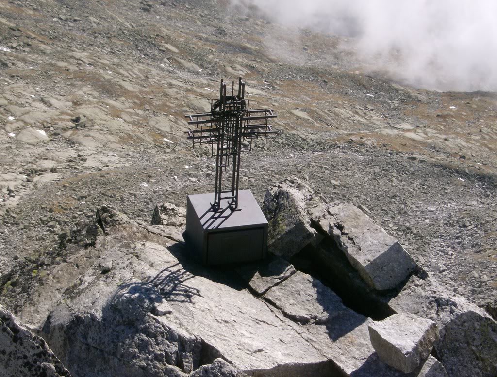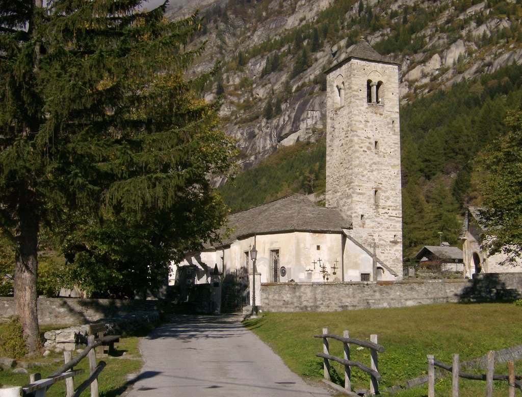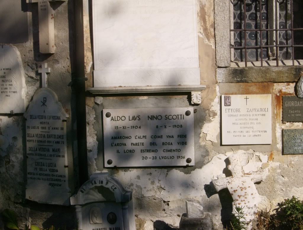 En el cementerio situado intramuros encontramos las lápidas de los alpinistas caídos en la Pared Este del Monte Rosa. Abajo a la derecha está la de Ettore Zapparoli, novelista y músico aperturista de varias vías gran prestigio en la Pared. Falleció a los 52 años de edad mientras trataba de abrir, en solitario, la vía directa a la Punta Zumstein, la más peligrosa de todas. Repasando datos para esta entrada he descubierto que sus restos mortales no fueron encontrados hasta el 9 de septiembre de 2007, justo cuatro semanas antes de la excursión que estoy describiendo. Después de que el excursionista que dio accidentalmente con dichos restos diera aviso, y se procediera a los análisis genéticos, se pudo finalmente confirmar la identidad ya sospechada del alpinista accidentado.