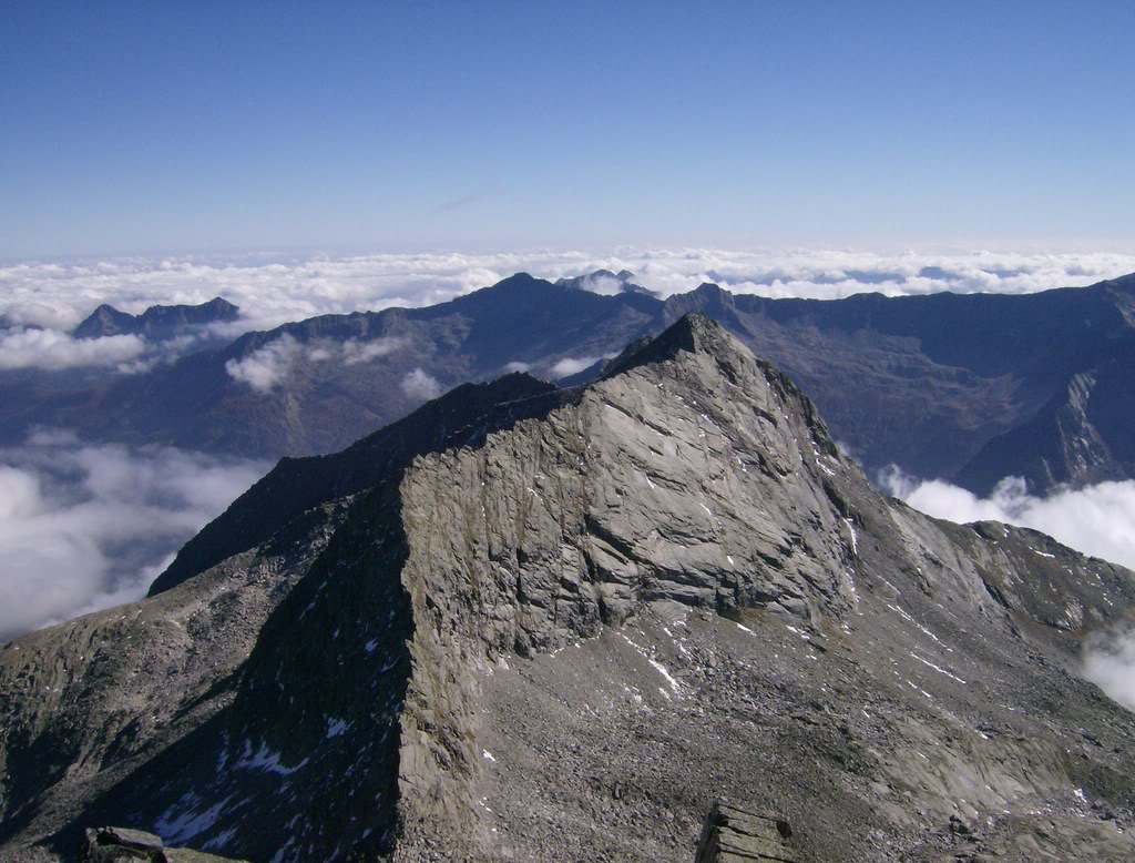 Hacia el este, justo debajo de nosotros, el Passo Mondelli y la afiladísima cresta que conduce al Pizzo de Antigina. A la derecha Italia, a la izquierda Suiza.