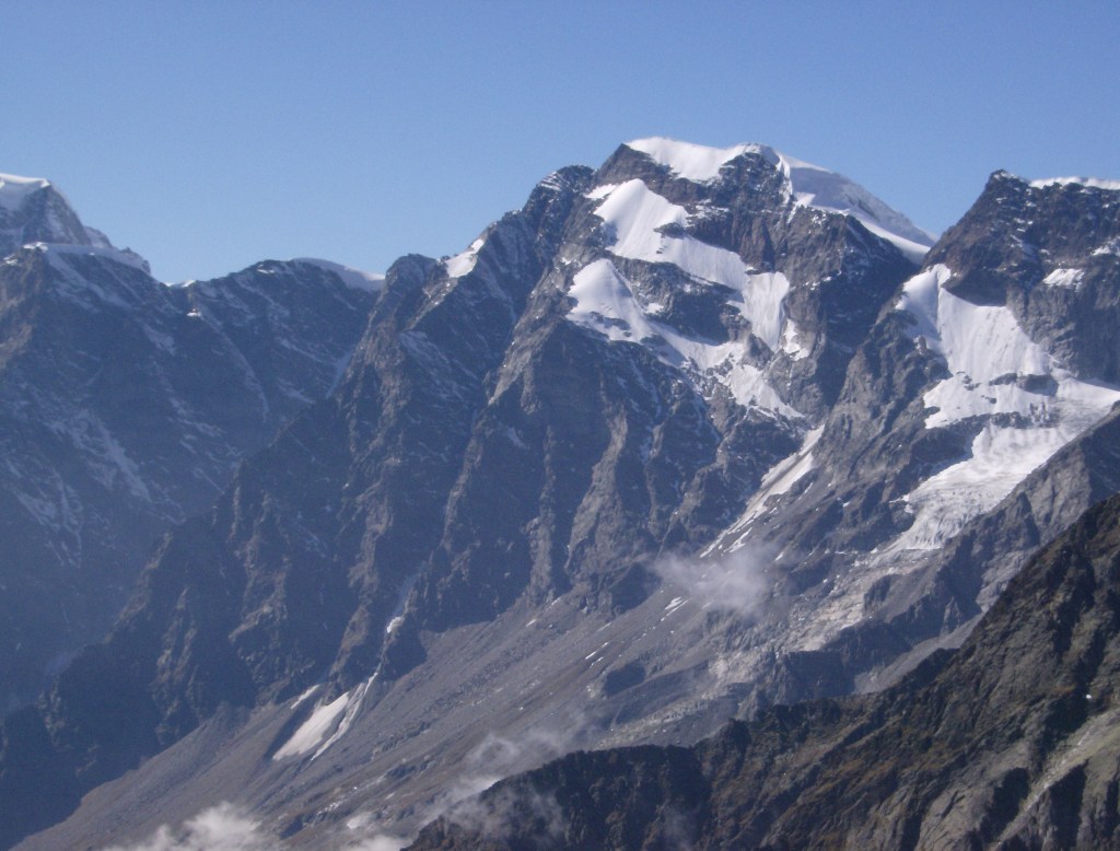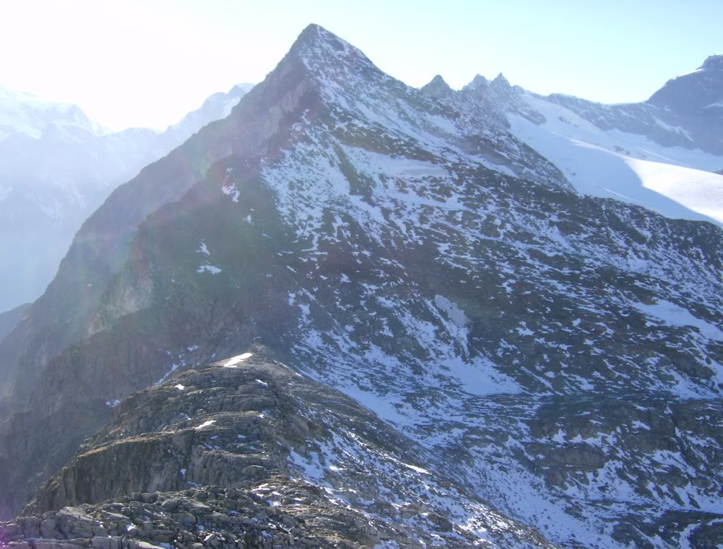 Desde aquí el panorama es mejor que desde el Joderhorn. Aquí la Weissmies (4017 m), por su lado «negro», pero se adivina su cúpula blanca arriba. Este fue mi primer cuatromil en absoluto, lo subí por la cara opuesta.
