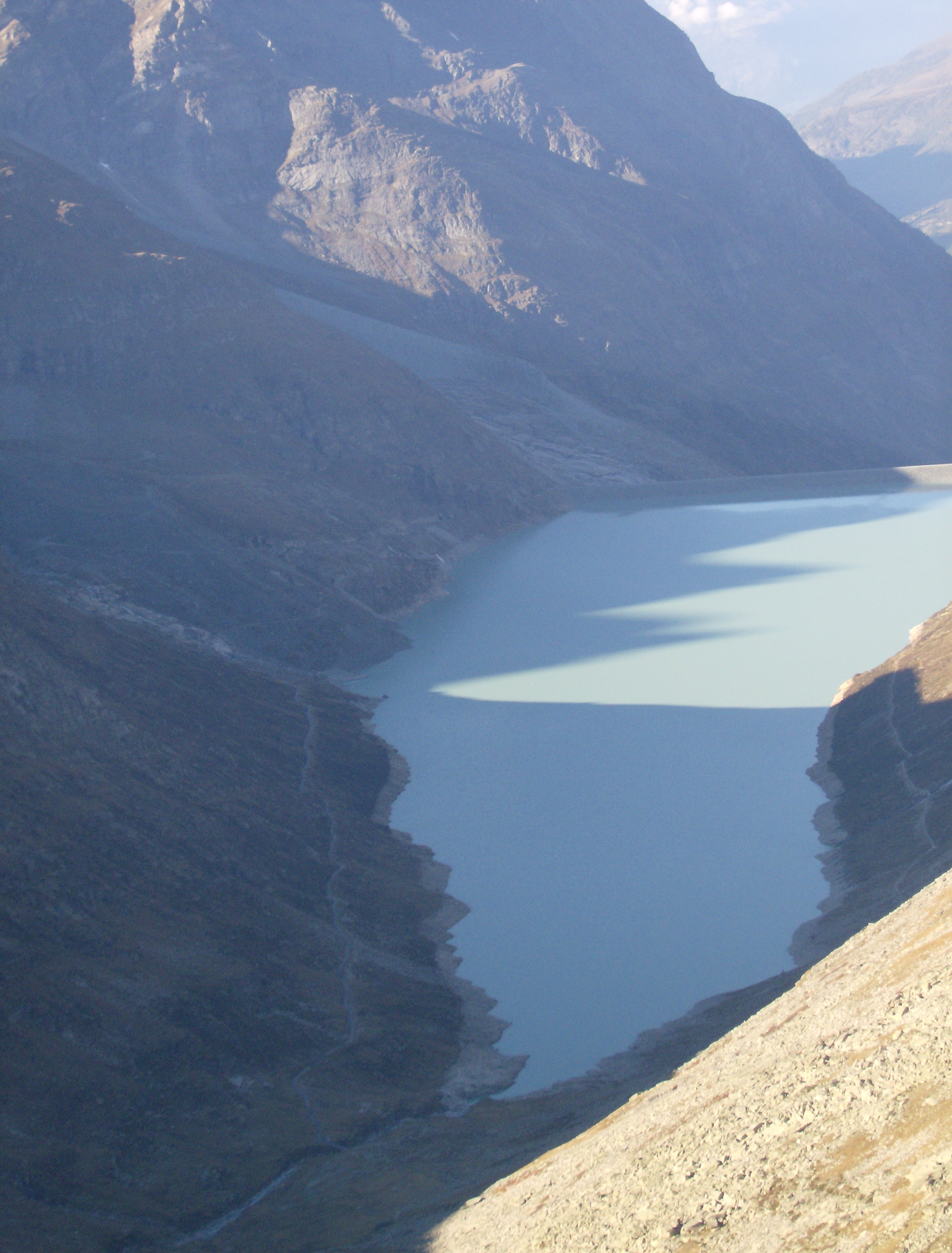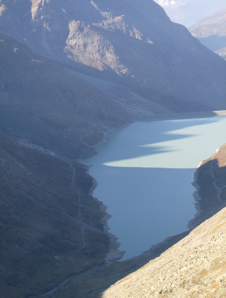 El lago Mattmarksee, a donde desciende la ruta que he traído desde Macugnaga, también tiene mejor perspectiva desde aquí.