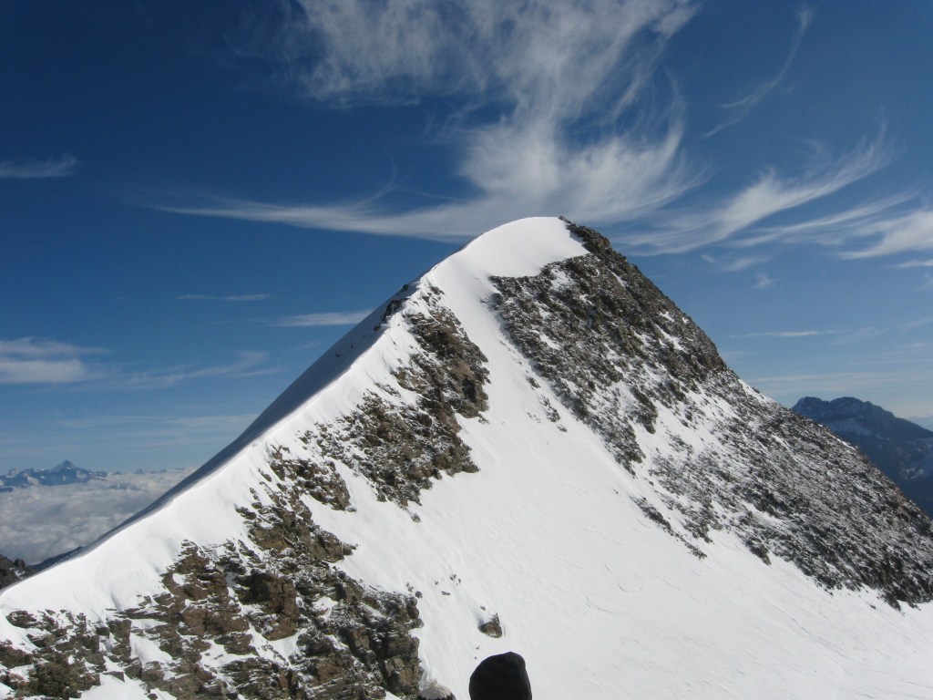 Finalmente echamos a andar y en menos de media hora, por buena huella y sin complicaciones, estamos en la cumbre del Ulrichshorn. Son las nueve. Disfrutamos un montón allá arriba. No es un 4000, no es lo que habíamos planeado, pero eso da lo mismo. Montaña magnífica, cielo límpido, paisaje estupendo. ¿Qué más se puede pedir?. Desde este mirador privilegiado se tiene la mejor visión del Nadelhorn y sus tres aristas. La NE, frente a nosotros, que baja al Windjoch, la SE que lo une al Lenzspitze, y la NO o Nadelgrat, un recorrido estupendo y no difícil (pasos de II máximo) que incluye otros tres cuatromiles y con el punto de apoyo de la Bordierhütte en la vertiente de Matter. Este recorrido lo tengo en mi lista de deseos, sin duda.