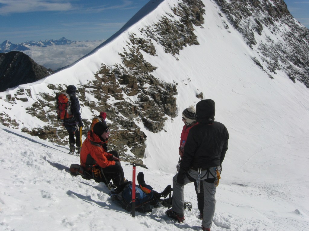 Nos tomamos un descanso y buscamos un emplazamiento ligeramente menos expuesto al viento, algo por debajo del propio collado. Aquí coincidimos con otras cordadas, que al igual que nosotros deben decidir si seguir adelante hacia el Nadelhorn o partir en dirección contraria, a la derecha, buscando un plan B que no desmerezca la excursión. Y ese es el Ulrichshorn, y esa es la decisión que tomamos nosotros. Hay buena huella hacia el Nadelhorn, pero el viento de costado en esa arista tan expuesta puede ser traicionero. Y como físicamente hablando ha habido días mejores, ¡la decisión está tomada!.