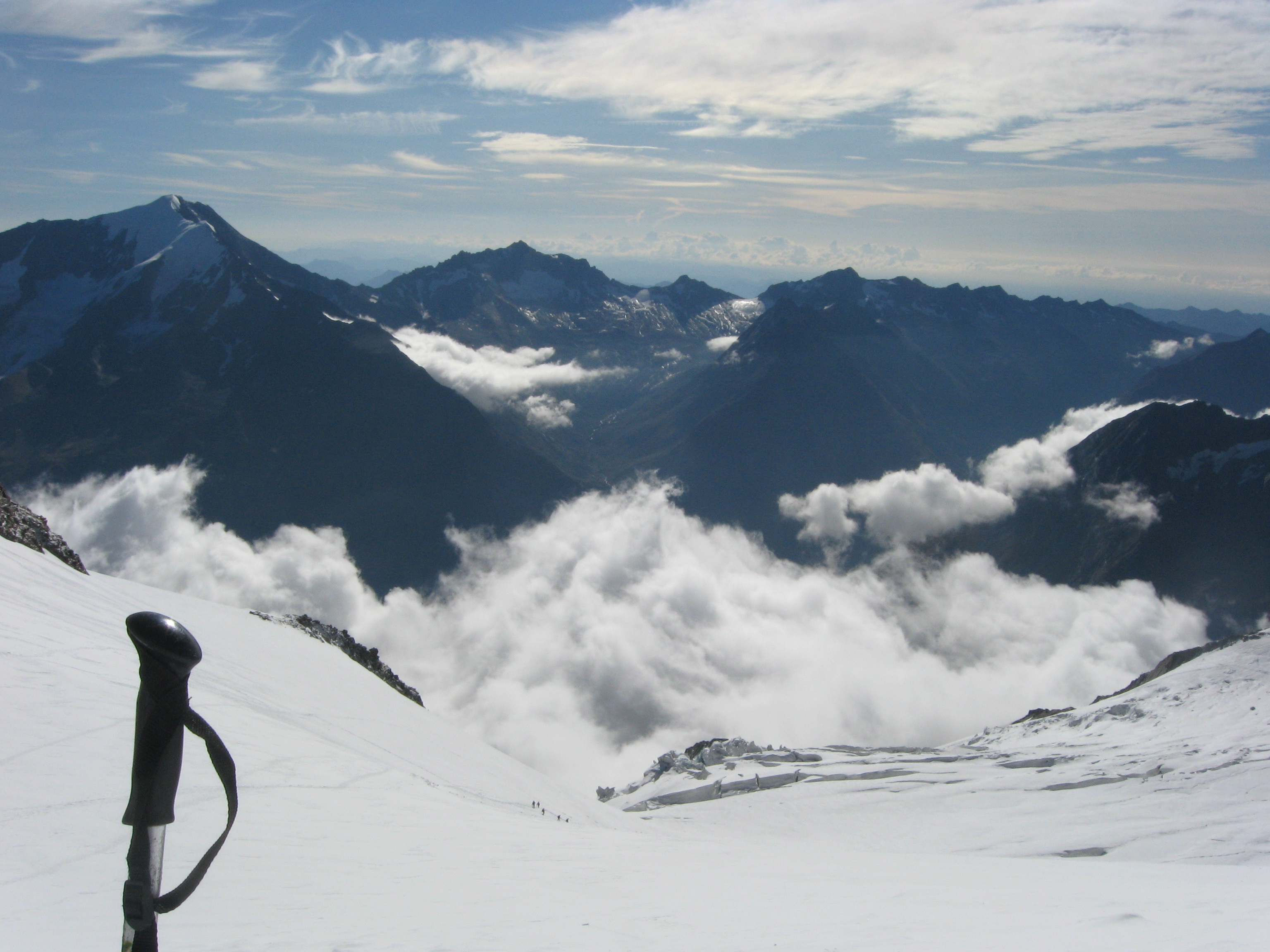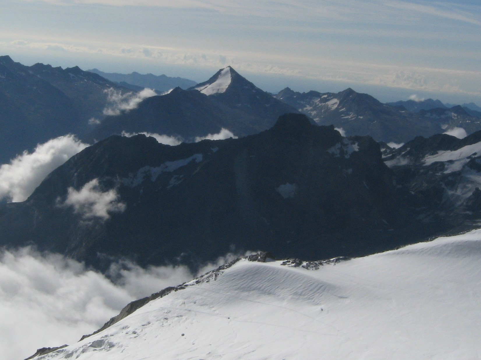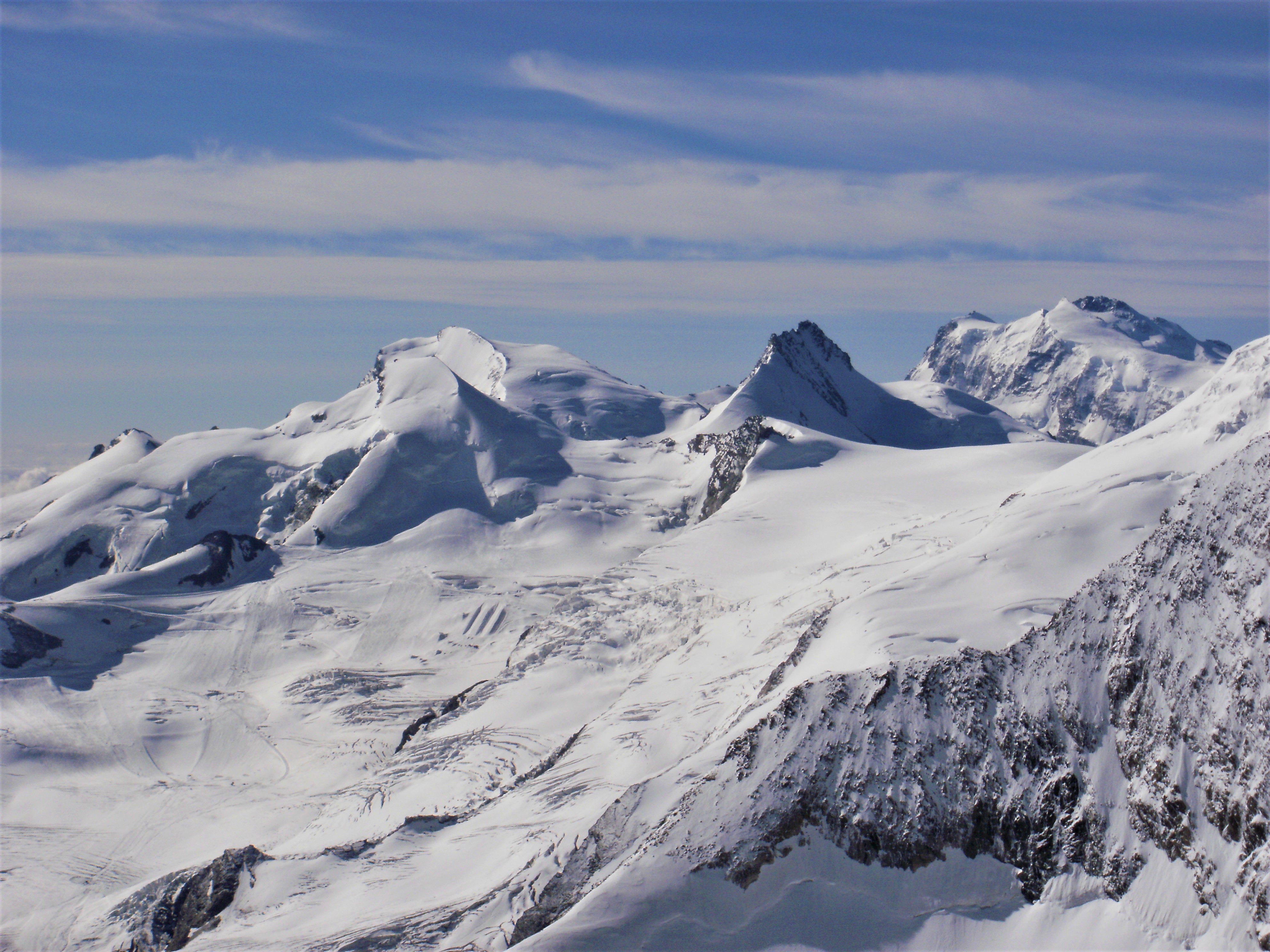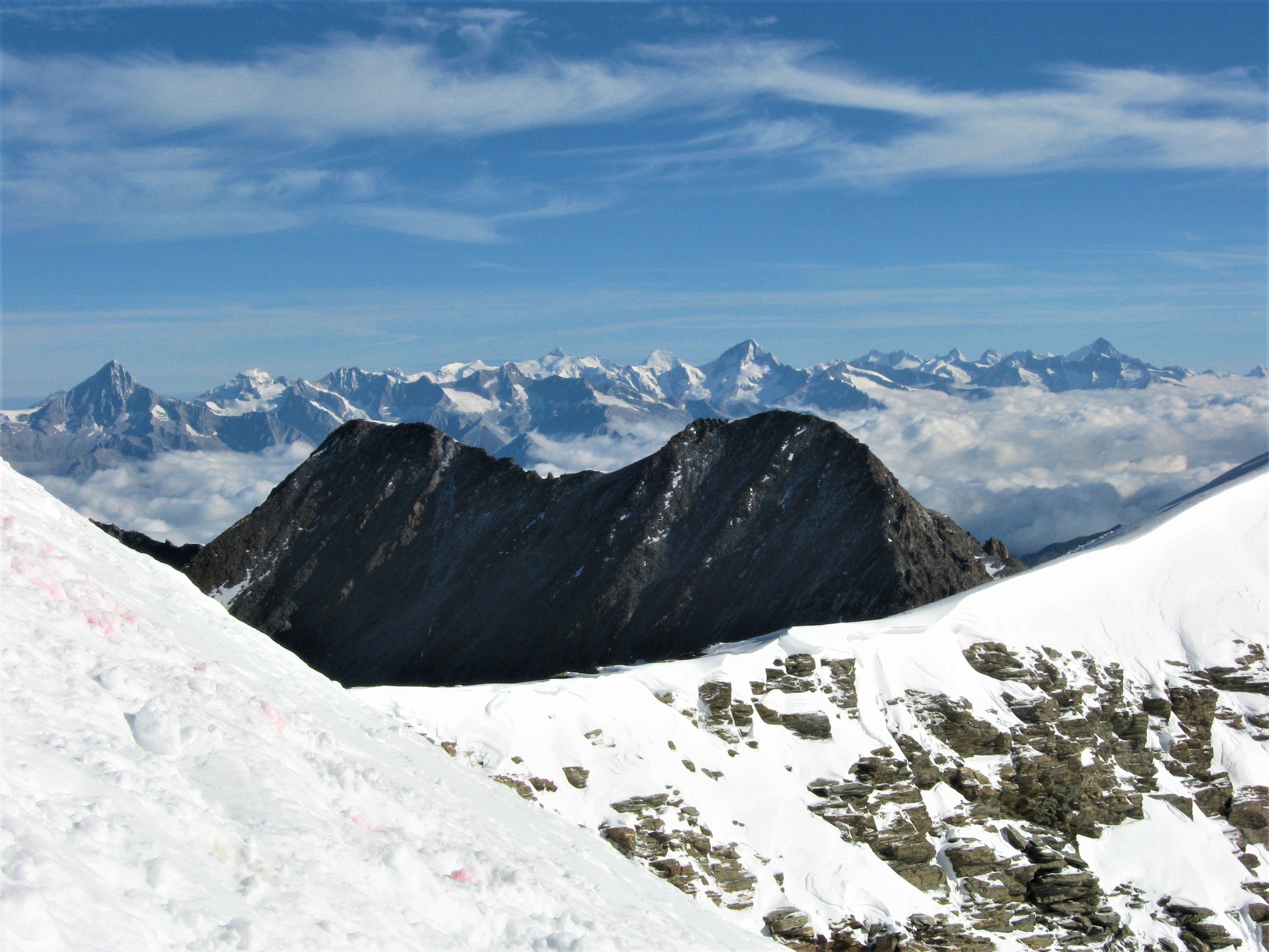 Siguendo el cordal hacia el sur, el Dom y el Taschhorn quedan ocultos detrás del Lenzspitze, pero sí se pueden distinguir el Strahlhorn, Allalinhorn y el Rimpfischorn, así como el Monte Rosa sobre la cadena axial.