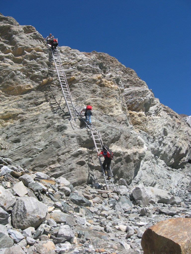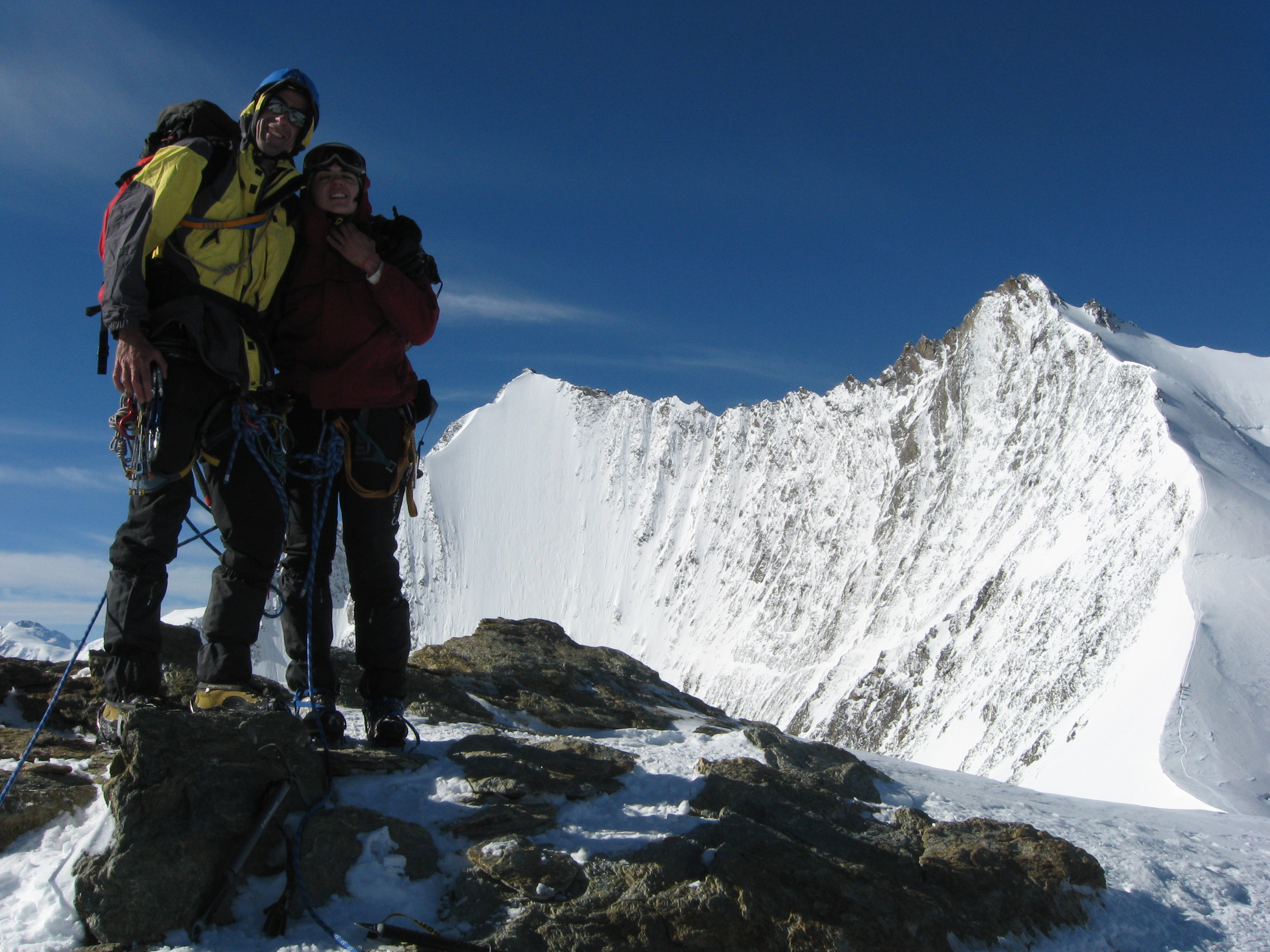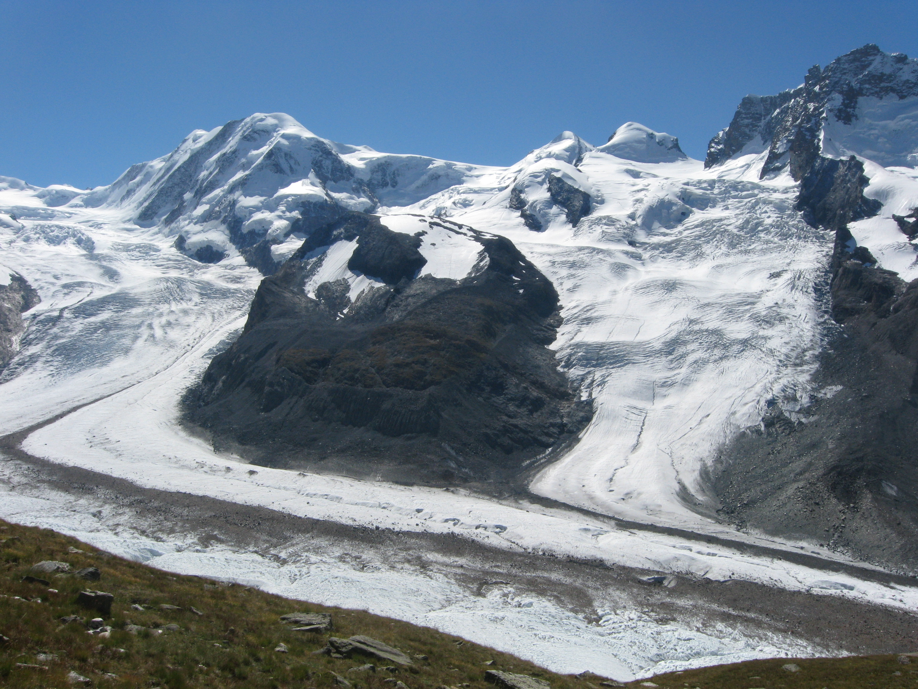Los últimos días de Agosto de 2010 toca un poco de alpinismo «familiar». En un alarde de optimismo me he venido arriba y he diseñado un plan sumamente ambicioso. Visitaremos el Valais suizo e intentaremos la Dufourspitze, pico más alto del Monte Rosa, por la vía normal desde Zermatt. Para aclimatar subiremos al Nadelhorn (4327 m), un pico maravilloso y técnicamente bastante sencillo, punto culminante de la arista Nadelgrat, desde Saas Fee. Si bien el nivel alpinístico de ambas montañas es relativamente sencillo, sin tener que hacer escalada en roca o hielo (La Punta Dufour tiene un paso rocoso de II-III justo al final), los desniveles permiten pocas bromas. La Punta Dufour tiene 1900 m el día de cumbre desde el Refugio Monte Rosa. El Nadelhorn «sólo» tiene 1000 m de desnivel desde el refugio Mischabelhütte, pero para acceder a él hay que haber superado previamente otros 1500 m desde la población de Saas Fee.