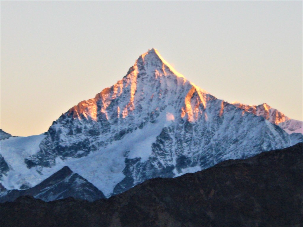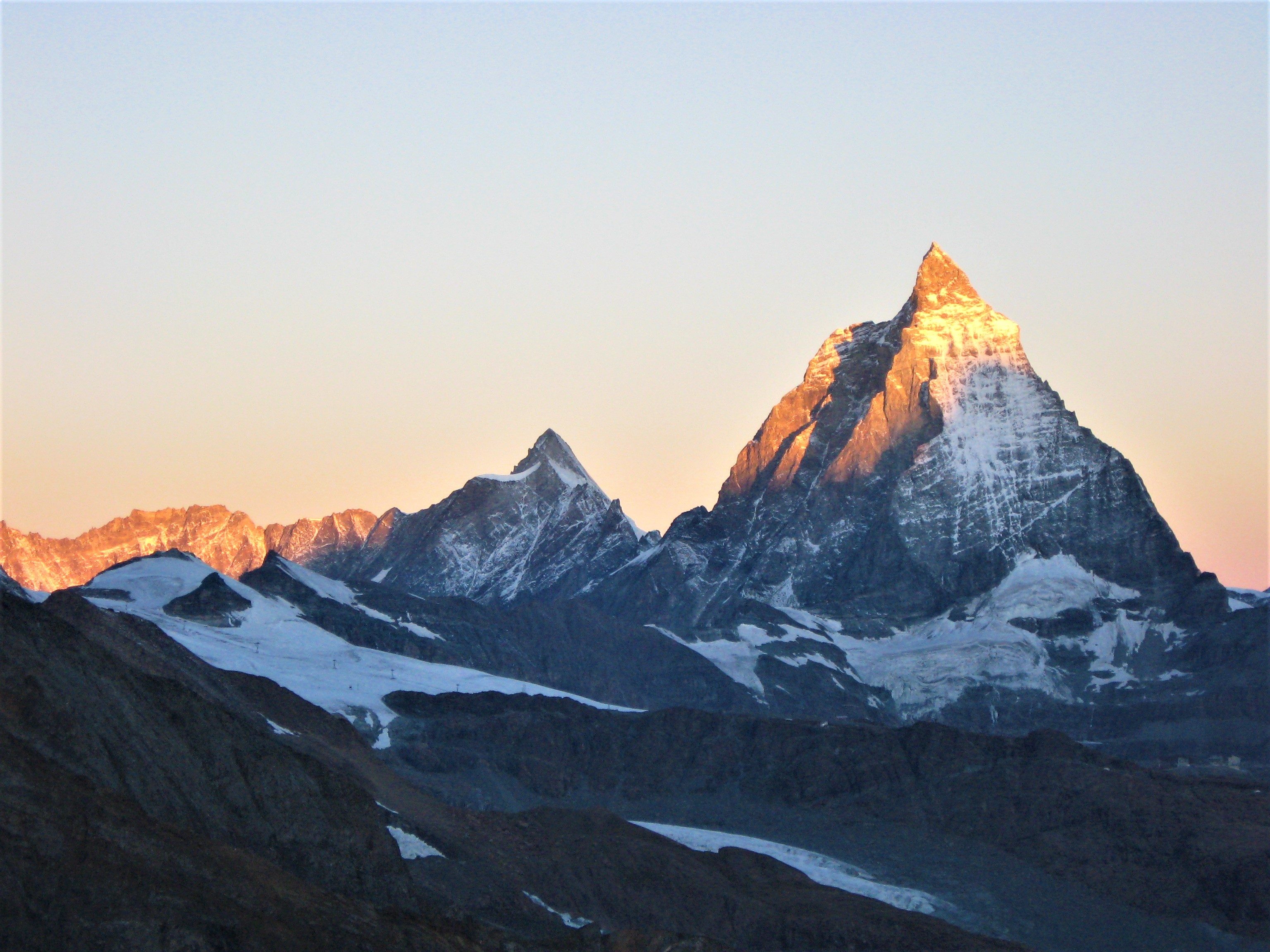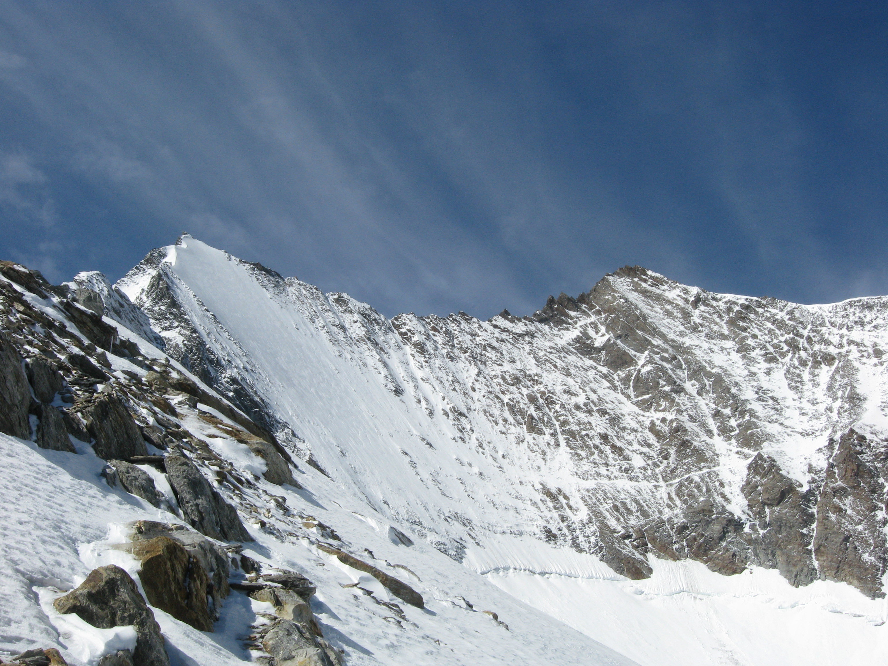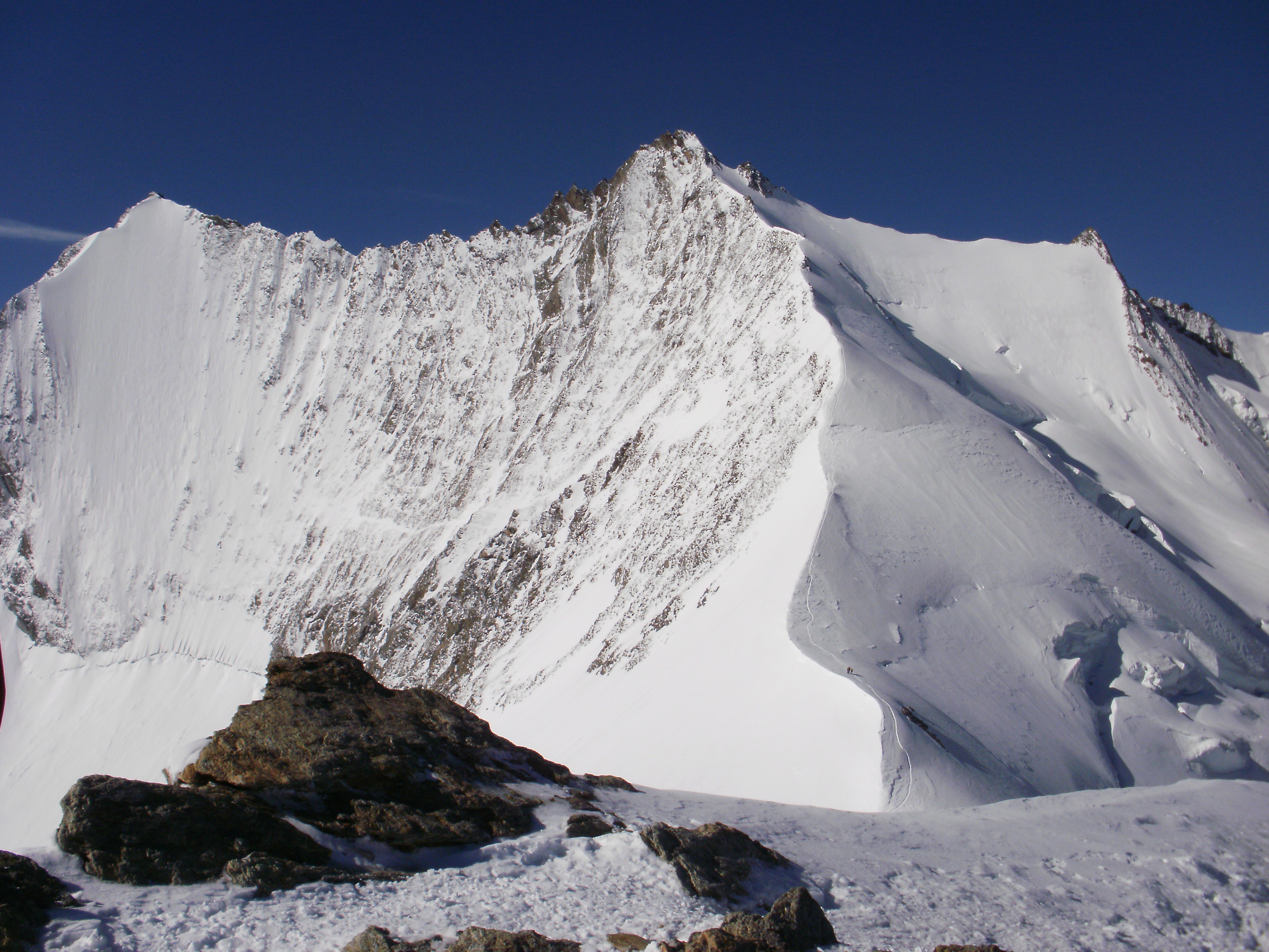 Y sin embargo este valle y el vecino de Matter son un imán irresistible para alpinistas de todo el mundo. La cantidad de magníficas montañas a las que se puede acceder desde Zermatt y Saas es sencillamente apabullante. La cadena axial de los Alpes ofrece dos atracciones de primer orden, el Cervino (4478 m) y la Dufourspitze (4634 m), además del cuatromil más fácil de la cadena, el Breithorn (4164 m), accesible en apenas 300 m de desnivel gracias al teleférico de Klein Matterhorn, y cimas de prestigio como Liskamm (4527 m), Castor (4228 m) y Pollux (4092 m). De esta cadena se desprenden perpendicularmente dos cordales laterales. Entre el valle de Matter y el de Zinal, al oeste, la cresta se alza en las cimas de Obergabelhorn (4063 m), Zinalrothorn (4221 m), culminando en el soberbio Weisshorn (4506 m), en mi opinión la montaña más hermosa de los Alpes. Entre los valles de Matter y de Saas el cordal arranca con el Strahlhorn (4190 m) y Rimpfischhorn (4199 m), prosiguiendo con una majestuosa cresta de alta dificutad que une cuatro poderosas pirámides de gneis: Täschhorn (4491 m), Dom (4545 m), Lenzspitze (4294 m) y Nadelhorn. A sus pies, orientado al este hacia el valle de Saas, esta cresta define un enorme anfiteatro con paredes que ofrecen itinerarios de gran compromiso para los mejores alpinistas.