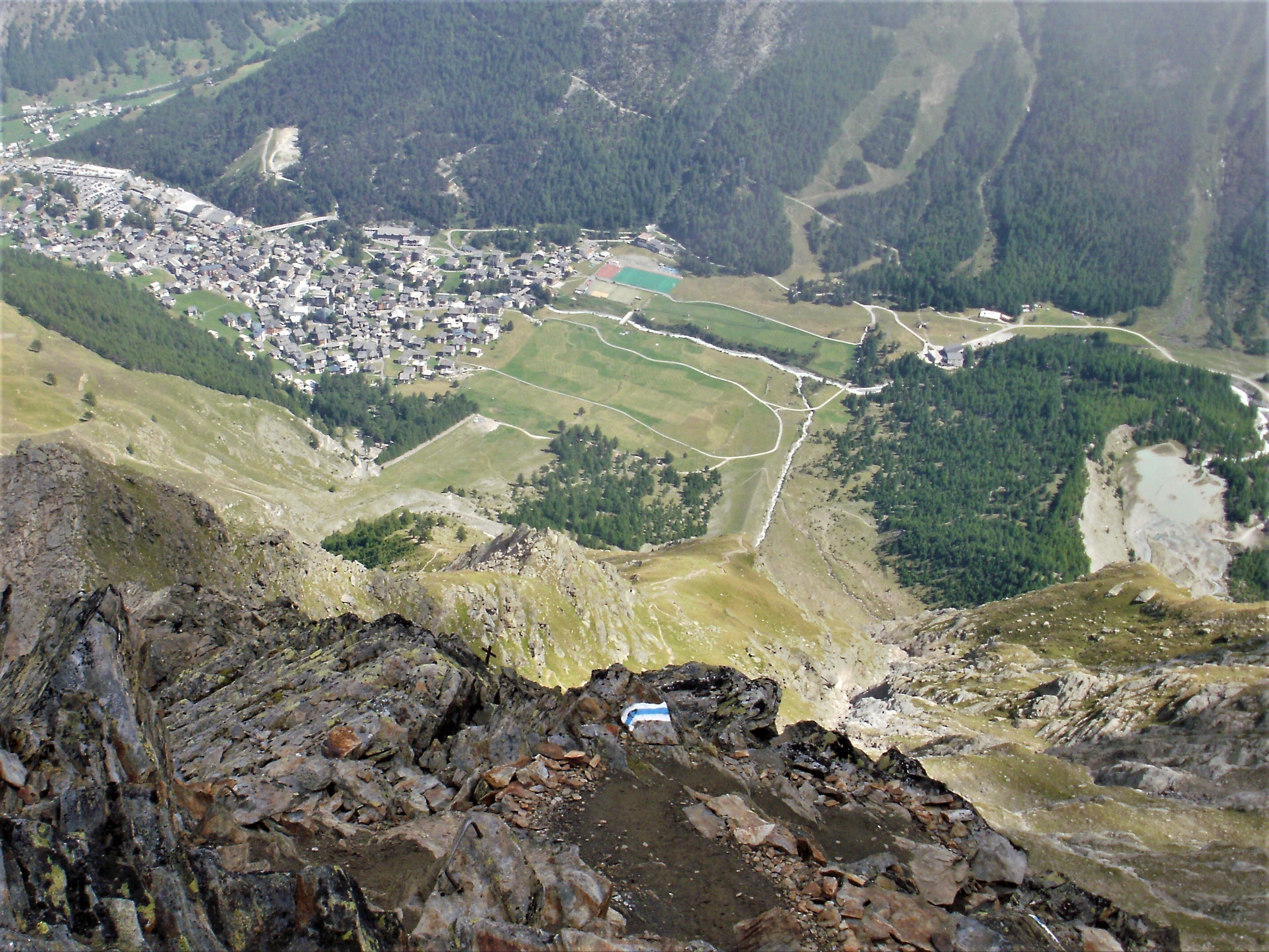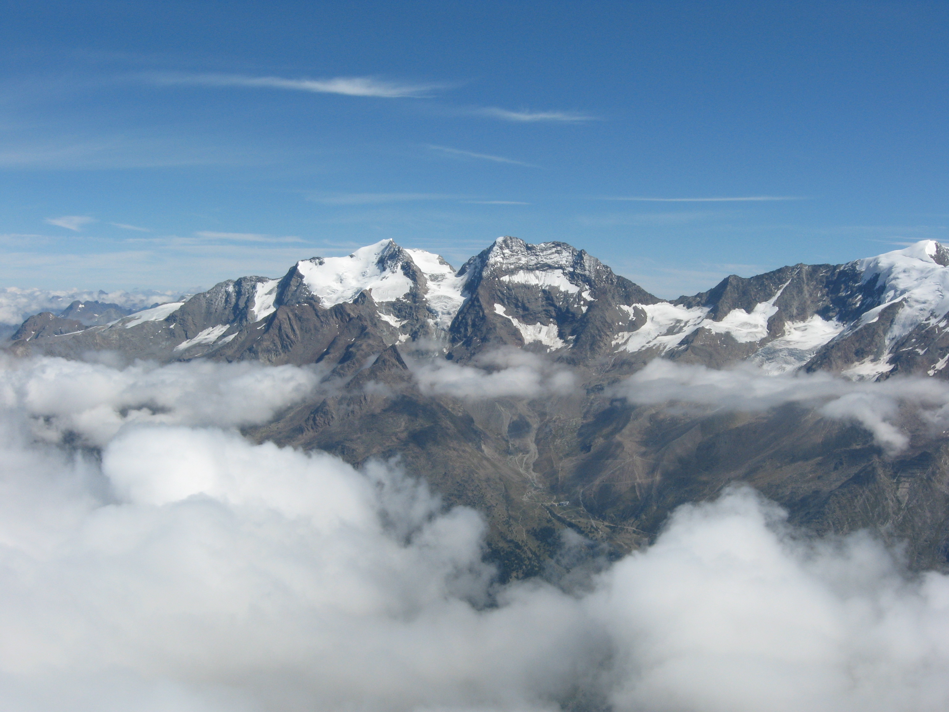 Hacia la vertiente opuesta, tenemos en primer plano la cumbre bicéfala del Balfrin. Al fondo distinguimos la cadena de los Alpes Berneses, con los grandes Finsteraarhorn y Aletschhorn bien distinguibles.