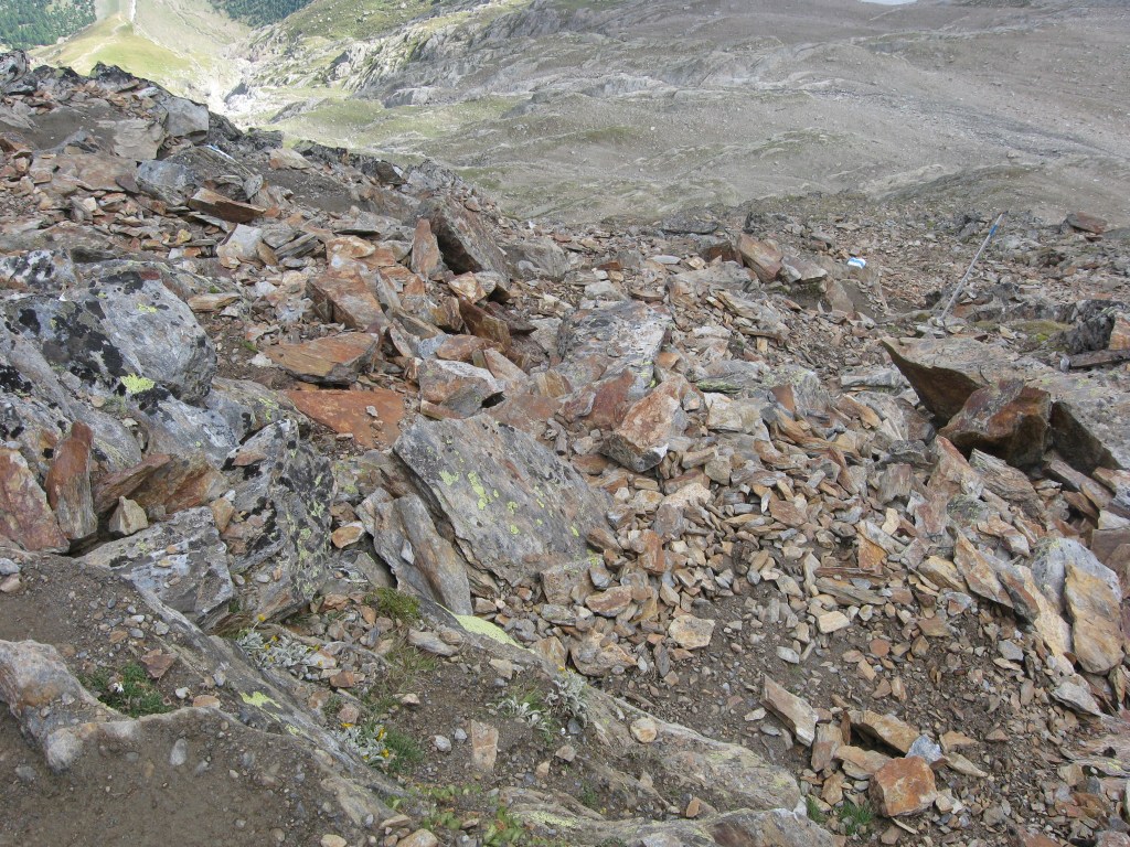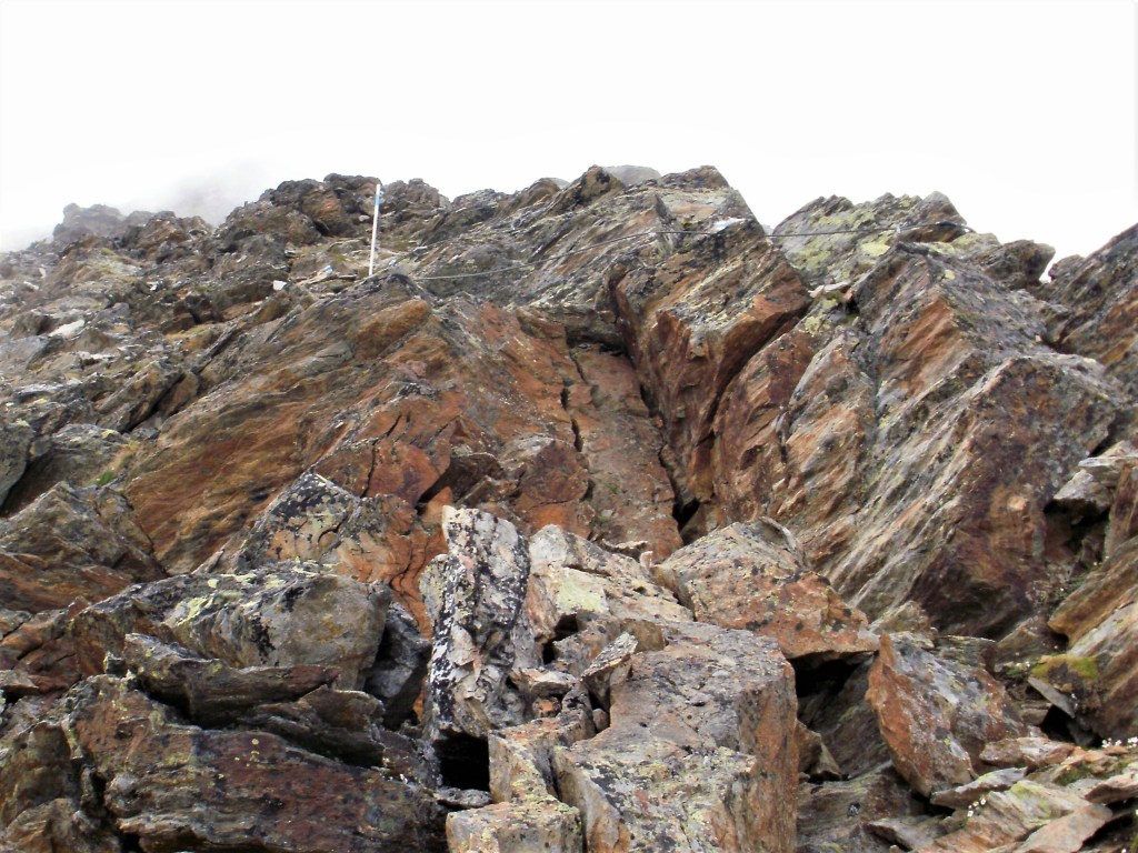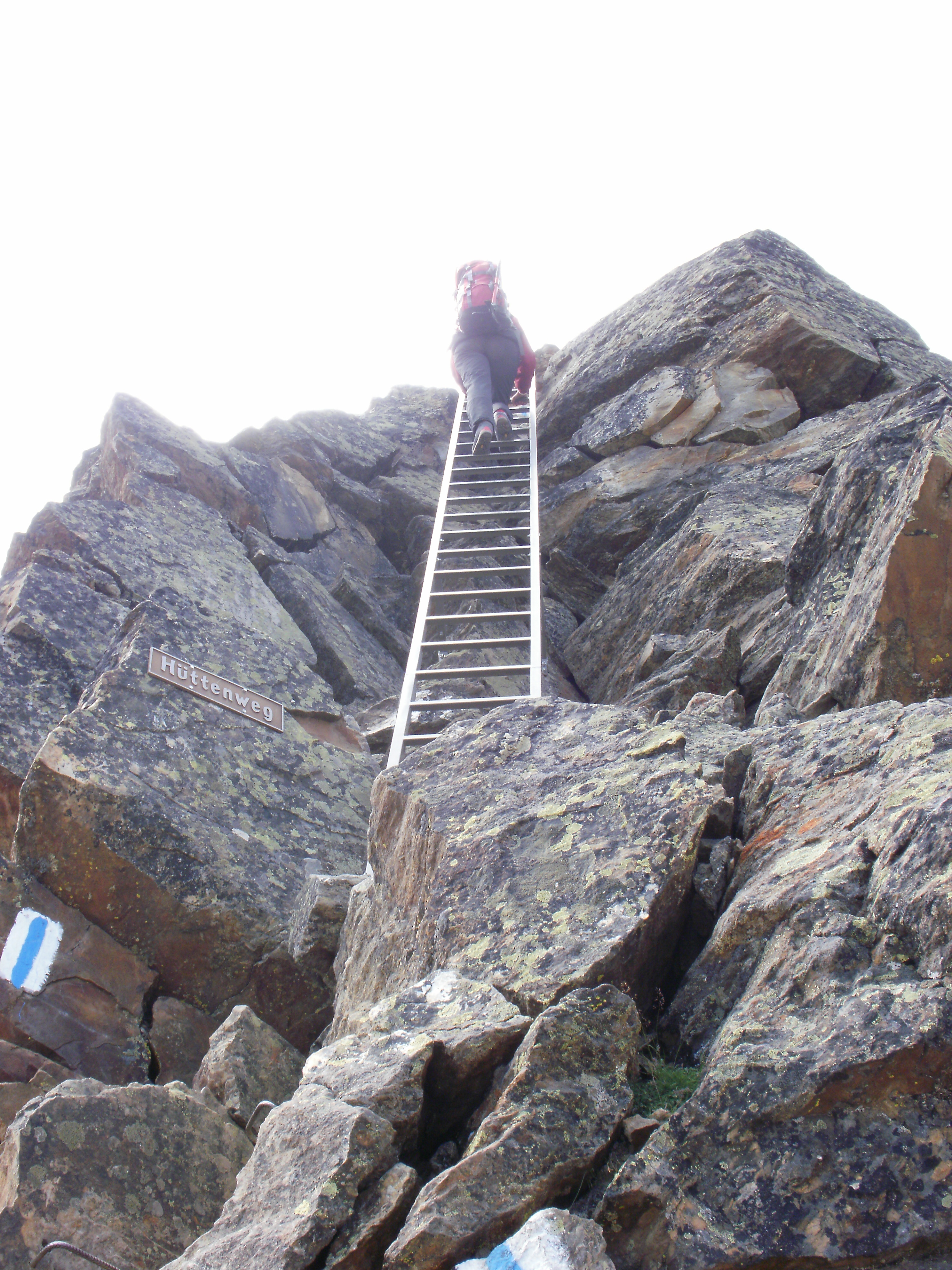 La ruta pedrestre arranca en el extremo opuesto del pueblo, tomando como referencia el aparcamiento. El sendero se encuentra bien señalizado, hay que buscar las pistas Stafelwald y atravesar el torrente Torrenbach. Desde aquí comienza zigzagueando una implacable subida que por terreno rocoso y depósitos morrénicos conduce al refugio. Hay un tramo bastante largo equipado, de vía ferrata fácil, con cadenas, pernos y hasta escaleras; se pasa sin problemas sin necesidad de asegurarse, pero se requiere pie firme y la mochila pesa. Avanzamos más lentos de lo que esperábamos, se nos echa la noche encima y debemos afrontar la última parte a la luz de las frontales. Afortunadamente el camino está bien balizado y no nos perdemos. Muestro algunas fotos de la subida al refugio, tomadas el día siguiente durante la bajada. Durante la subida no teníamos ni el ánimo ni el tiempo para fotografiar nada.