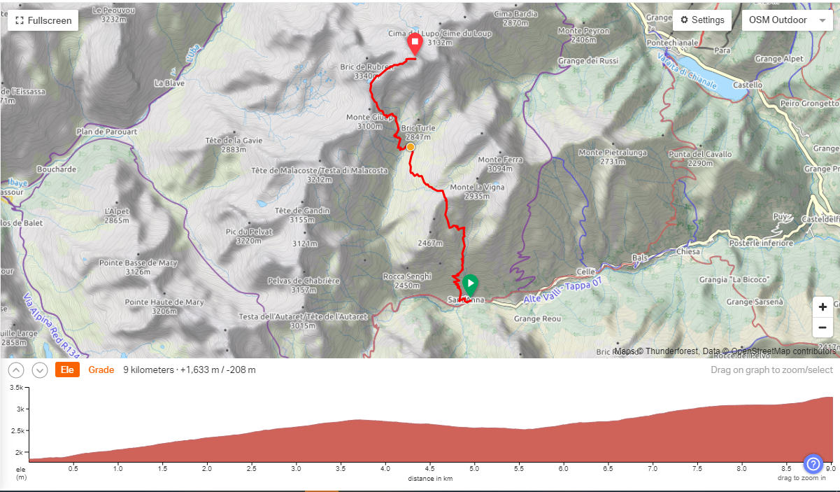 Si quiero coger la vía normal debo llegar hasta el lago, que está helado, y el pequeño refugio, que se distingue sobre la cresta a la izquierda. Hay huella hasta allá, así que esa persona ha tenido la misma «confusión» que yo. No está muy lejos, pero ando ya apurado de tiempo y no me sobran las fuerzas. Justo a mi derecha hay un pico bien destacado, con cruz. Una pendiente empinada, pero está aquí mismo. Ese tiene que ser el Salza, de 3326 m y al norte del Mongioia. Vamos a por él, que también merece la pena.