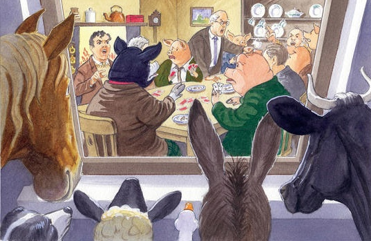 ¿Y todo esto para qué? No hace falta recurrir a novelescas conjuras en tenidas ocultas ni a fabulaciones truculentas de sociedades secretas. Mucho más simple, dinero y poder, lo de siempre. La obviedad de la confluencia de intereses entre gobiernos y plutócratas está ahí para quien quiera verla, y resulta particularmente embarazosa para quienes se autoproclaman defensores de los pobres y oprimidos. Por poner sólo un ejemplo, el presidente electo de EE.UU., Joe Biden, ha nominado a Brian Deese como jefe del Consejo Económico Nacional. Se trata del jefe de inversión sostenible de Blackrock, la mayor gestora de fondos del planeta, con un patrimonio superior al PIB de cualquier país del mundo con la excepción de Estados Unidos y China. A esto se unen otros nombramientos de altos cargos vinculados a la industria armamentística, y a los grandes de Silicon Valley, que como es bien sabido le apoyaron abiertamente durante la campaña electoral. Biden no es desde luego el primer presidente en rodearse de pesos pesados de Wall Street, sin ir más lejos Trump echó mano de varios hombres de Goldman Sachs, pero esto nos debe ayudar a poner en perspectiva los discursos populistas en Estados Unidos y en el resto del mundo. Nuevamente recurrimos a Orwell, que había entendido bien de qué iba el asunto, y que nos lo dejó escrito en Rebelión en la Granja, un libro aparentemente menos sombrío que 1984, pero con un mensaje análogo. Hay una película, que debería ser de visionado obligatorio en las escuelas a partir de los doce años de edad, y cuyo final nos describe lo obvio, con los «libertadores» compadreando con los antiguos «opresores» contra quienes se habían levantado. No somos tan ingenuos como para ignorar que el ejercicio de la política real requiere tragaderas, chapotear en el fango y tener que relacionarse con elementos indeseables, por muy buenas intenciones que uno pueda tener. Luego al electorado se le venden idealismos, florecillas, justicias sociales y demás. No nos creamos mucho estas milongas y seamos un poco exigentes en cuanto a un mínimo de decencia y coherencia.