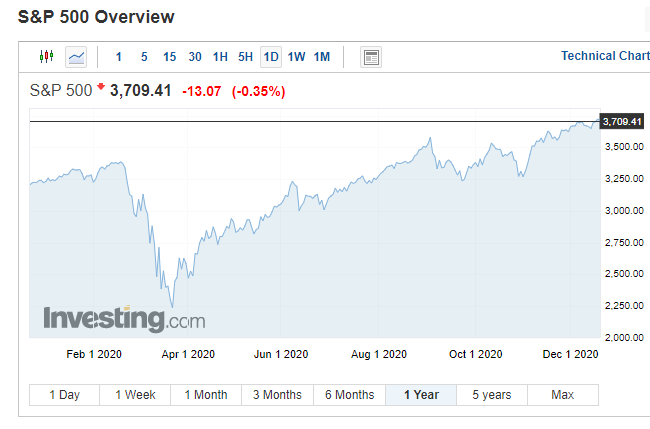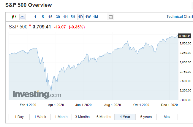 Los perdedores en la pandemia han sido sobre todo familias y pequeños empresarios, cuyos negocios han sido azotados por los cierres y las restricciones, condenando a muchos a la quiebra. El efecto es dejar vacantes nichos de mercado y bienes inmobiliarios que pueden ser ocupados a precio de ganga por los más grandes. Entre los propios grandes, la descapitalización de grandes empresas radicadas en un territorio permite a sus competidores hacerse con su control, dentro del contexto geopolítico de lucha por el poder entre Estados y corporaciones. Un ejemplo obvio de corporación triunfante y bien arrimada al poder político, es Amazon, aspirante a monopolista del comercio planetario, que empezó vendiendo libros y ahora nos ofrece casi de todo, desde consoladores y muñecas hinchables a placas Petri y microscopios de laboratorio, pasando por productos frescos. Recientemente hemos sabido que también se apunta al gran green business invirtiendo en instalaciones de molinos eólicos, lo que le permitirá al amigo Bezos de alardear de ambientalismo y compromiso con el planeta al tiempo que la maquinita del dinero sigue hacindo clink-clink. A costa del contribuyente, como sucede casi siempre (el inmenso negocio de la transición verde y la transferencia masiva de riqueza a empresas y fondos de inversión da para otro post). A los datos, echemos primero un ojo al comportamiento en el último año del SP500 o sea los 500 blue chips del mercado estadounidense, que naturalmente incluye a Amazon, además de Microsoft, Apple, Facebook y Google, las cinco compañías con mayor peso en el índice. Observamos el catacrock de Marzo seguido de una recuperación sorprendente y mantenida.