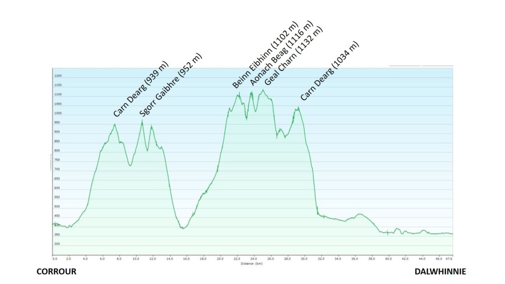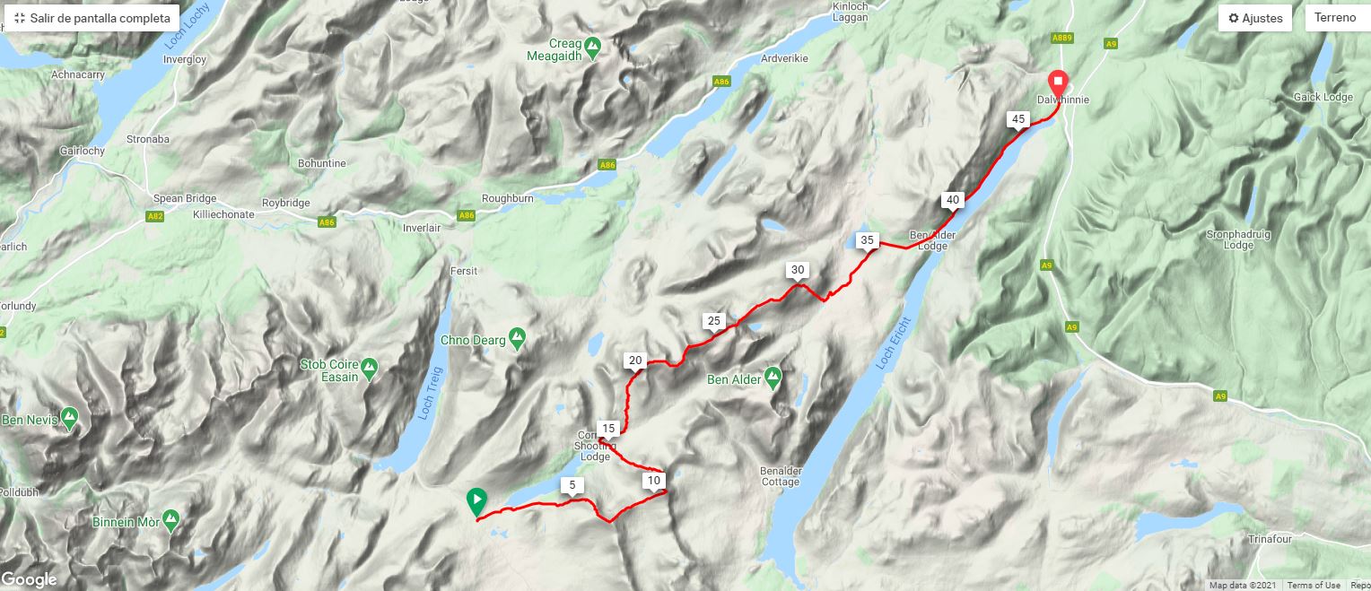 Los horarios de los trenes para dos estaciones tan pequeñas no permitían mucha flexibilidad. El último tren del día llegaría a Corrour a las nueve y diez de la noche del 23 de Junio, y yo debería llegar a la estación de Dalwhinnie antes de las once y media del día siguiente para coger el tren que me llevaría de vuelta a Edimburgo. Disponía pues de algo más de 14 horas para recorrer los casi 50 km que separan ambos puntos. Un retraso supondría tener que esperar hasta última hora de la tarde. El cálculo acabaría siendo más ajustado de lo previsto.