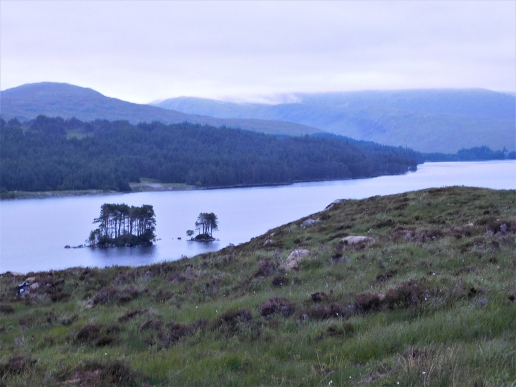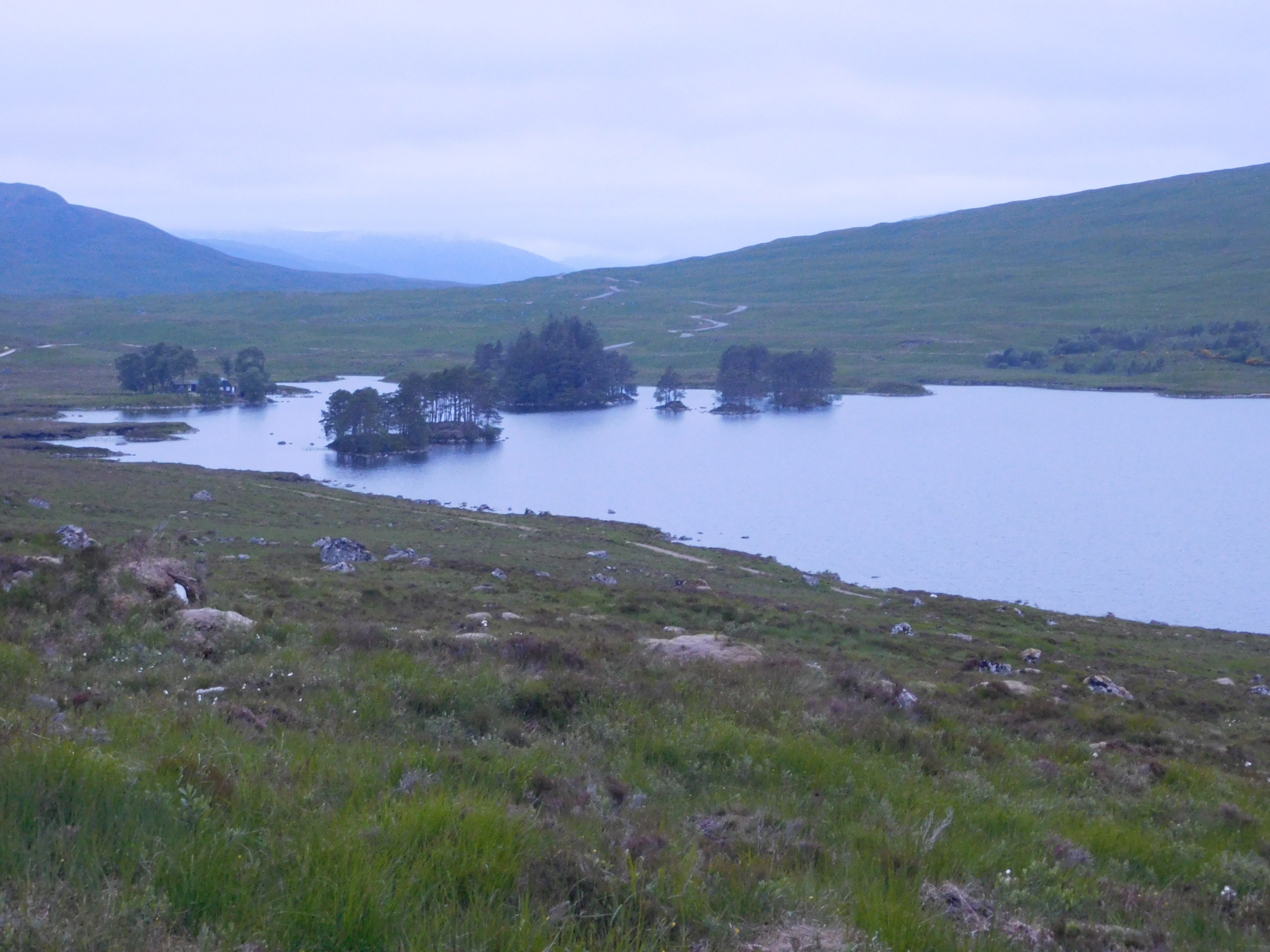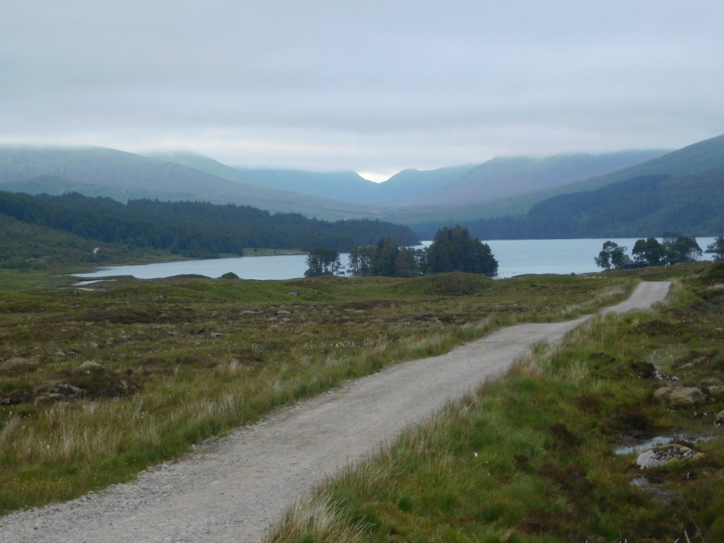 Una vez se alcanza el lago, al cabo de un par de kilómetros, la pista principal continúa por su orilla sur. Yo debo desviarme a la izquierda por un ancho camino que empieza a subir suavemente, flanqueando la ladera norte del Meall Na Lice. Este es el camino que conduce a la lejana estación de Rannoch, al sur. Escucho algunas voces más abajo. Posiblemente provengan del pequeño albergue cercano, o de alguna tienda oculta entre la arboleda. Me detengo y fotografío el lago. El ambiente está cargado de humedad, voy a buen paso y he comenzado ya a sudar.