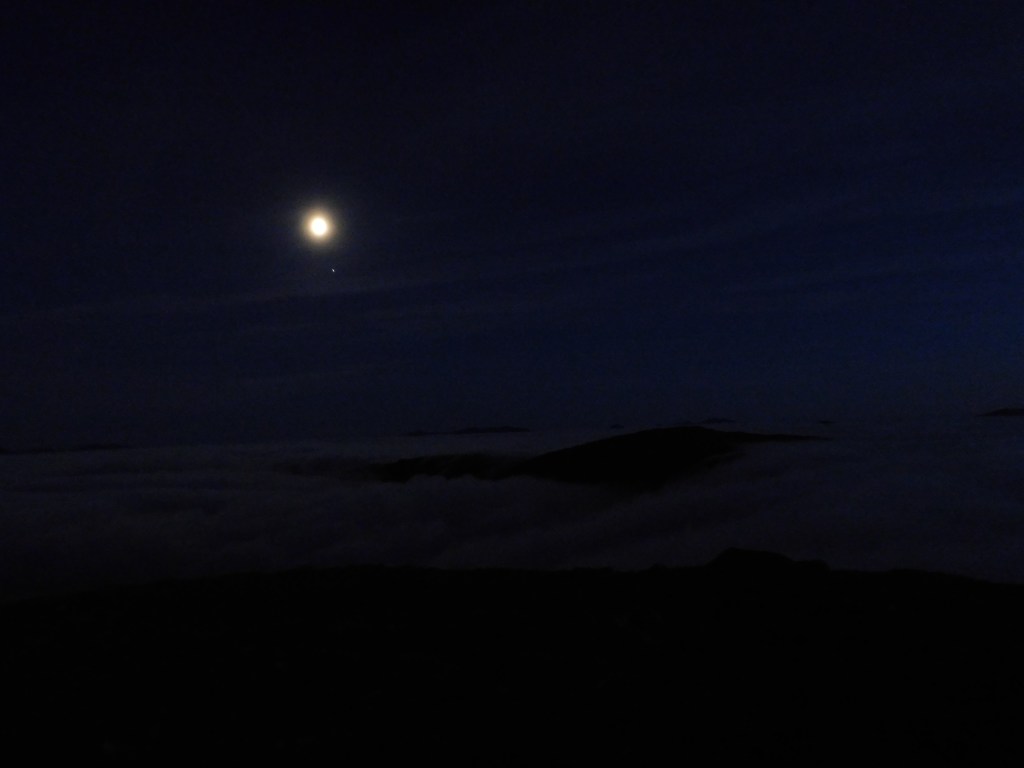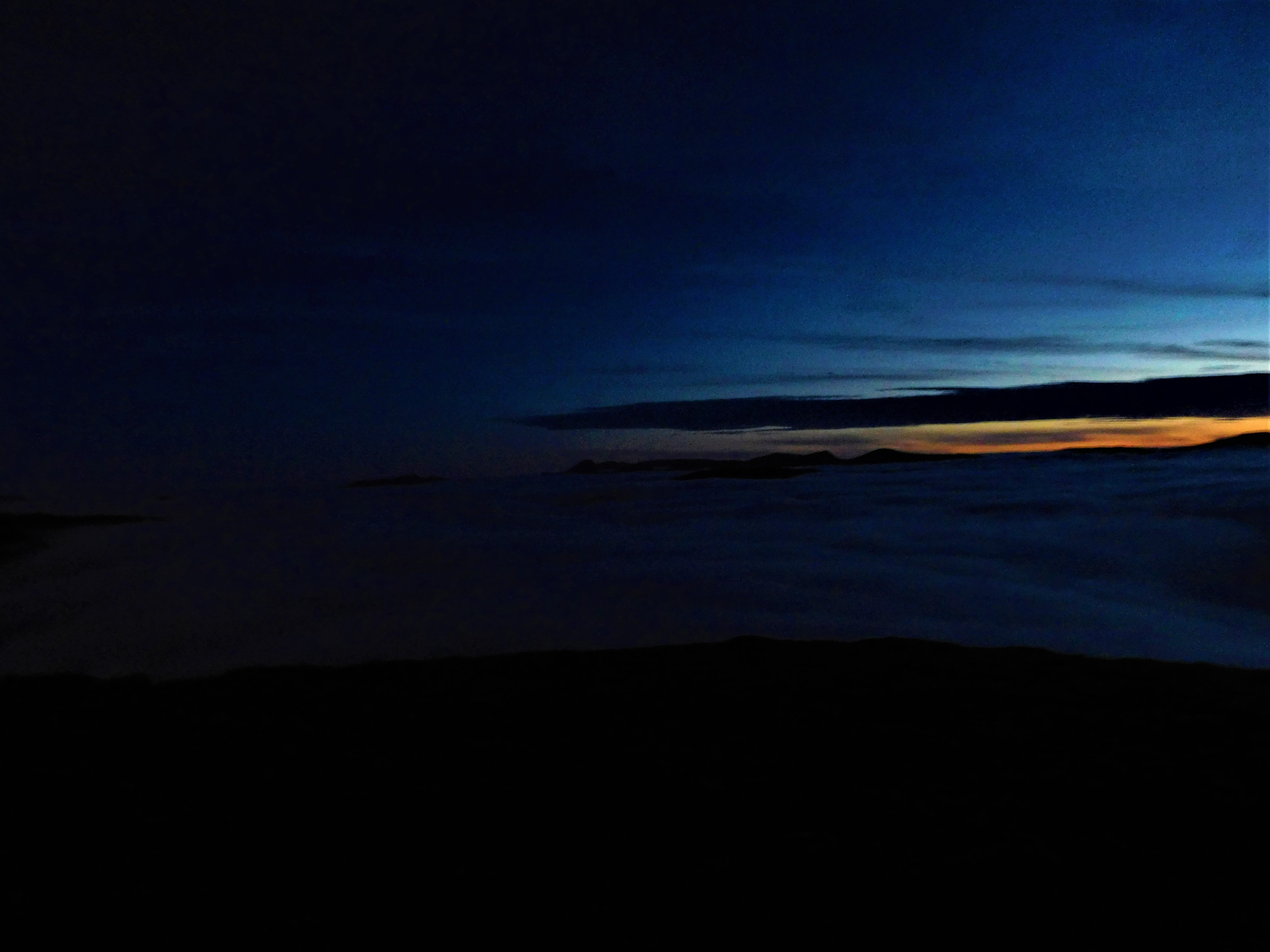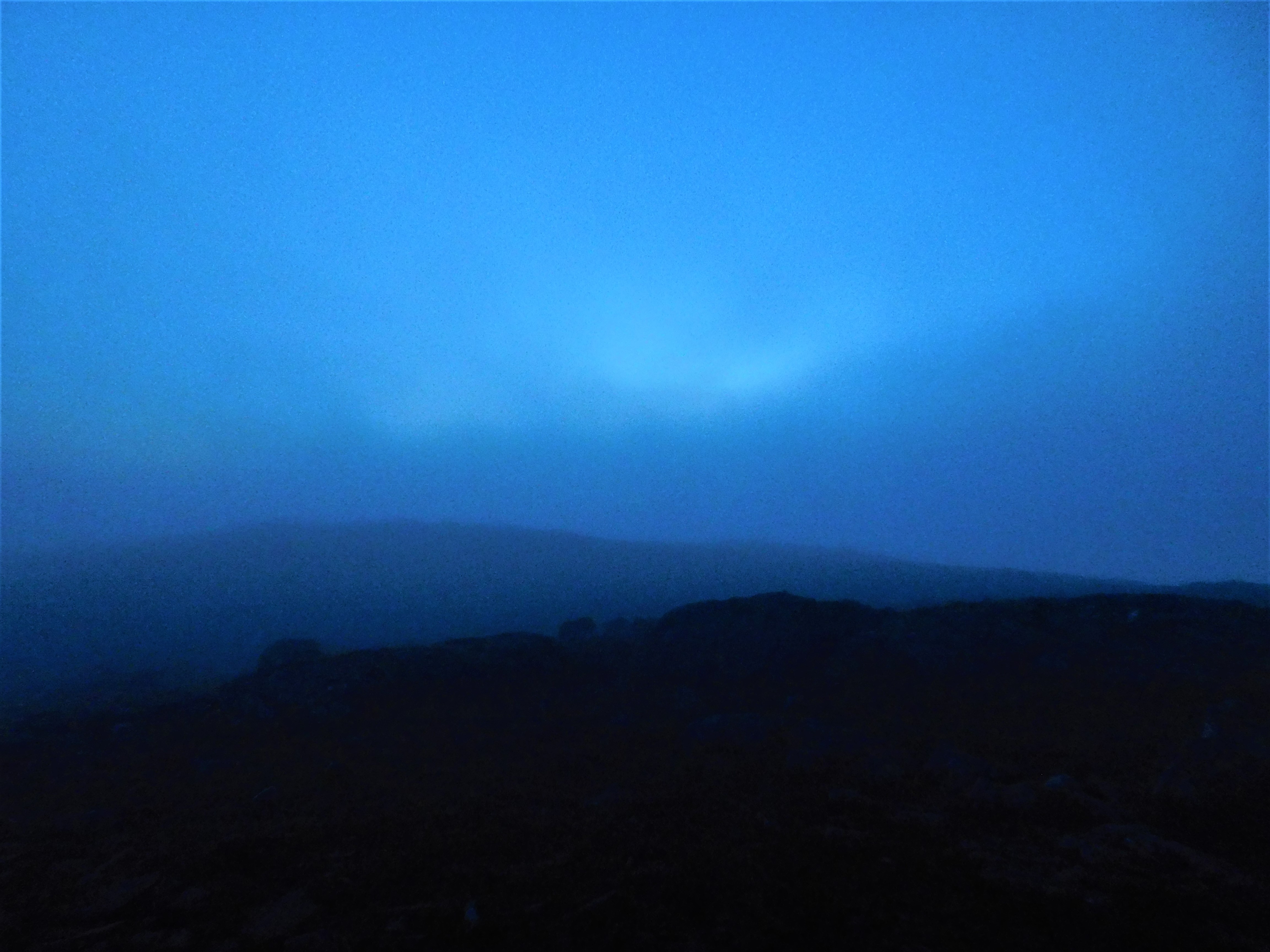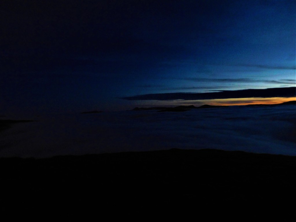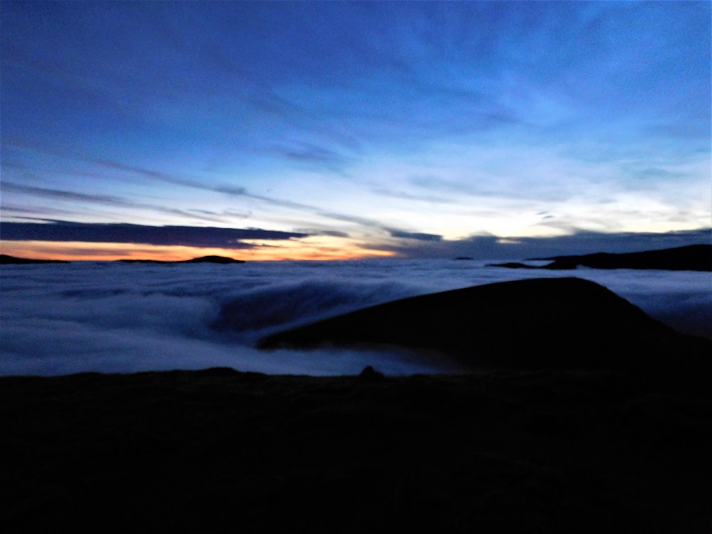 Había leído que el arranque del camino que por la arista este conduce al collado de Mam Ban era confuso. Pese a la niebla y la incumbente oscuridad, acierto a distinguir la cima del Sgor Gaibhre (955 m) que tomo como punto de referencia. A la luz de la frontal no me cuesta encontrar la traza, que baja por terreno rocoso y empinado hasta el amplio collado, donde la oscuridad y la niebla me hacen hundir las botas más de una vez en la turbera. Desde aquí me quedan más de 200 m de desnivel por un buen sendero hasta la cumbre. Unos cincuenta metros antes, llega el momento en que la niebla se evapora. Eufórico, alcanzo la cumbre minutos después de medianoche. La noche blanca me regala la visión sublime de las montañas surgiendo de un mar de nubes y perfiladas por la luz del sol apenas oculto bajo el horizonte.