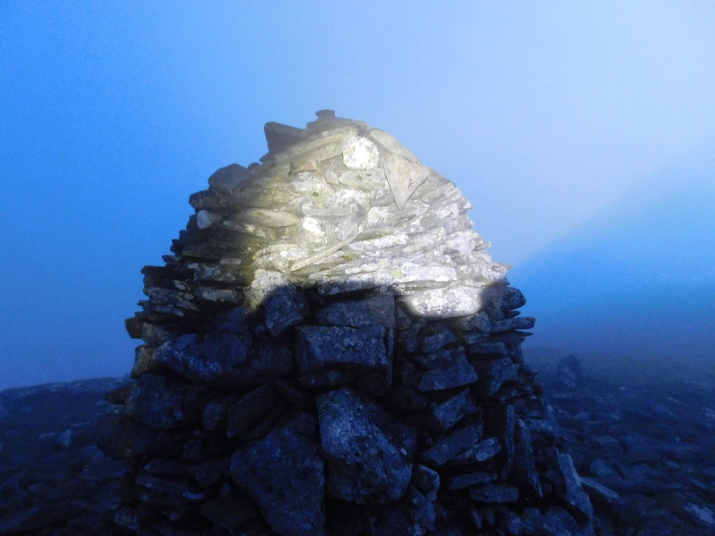 El camino se vuelve fangoso e intercepta otro que sube desde el lago en las inmediaciones de una roca con una placa conmemorativa metálica. A partir de aquí, a unos 500 m de altura, lo abandono y subo campo a través en dirección este, ya por dura pendiente. Son más de las diez de la noche, he entrado en la zona de niebla y cada vez está más oscuro. En este momento empiezo a añorar una cama caliente y me pregunto qué se me ha perdido en este lugar a esta hora. La soledad y el silencio llaman al sueño y atravieso un momento de flaqueza psicológica. En la hora en que llegan las tinieblas uno se siente más vulnerable. Paro a echar un trago de agua. Aunque aún hay suficiente luz, prendo la frontal; es una forma de hacerme a la idea de la noche inminente. La estrategia da resultado y voy recuperando el ánimo. Llego al Meall na Leithire Duibhem, donde giro 90º a la derecha para tomar la arista N del Carn Dearg (941 m). Intuyo la proximidad de la cumbre que finalmente alcanzo a las once y diez. El primer Munro de mi travesía. Siete kilómetros y medio de camino en poco más de hora y media, es un muy buen ritmo. Sin embargo, no puedo disfrutar del paisaje y que sigo dentro de la niebla, que da la impresión de romperse apenas unos metros más arriba.