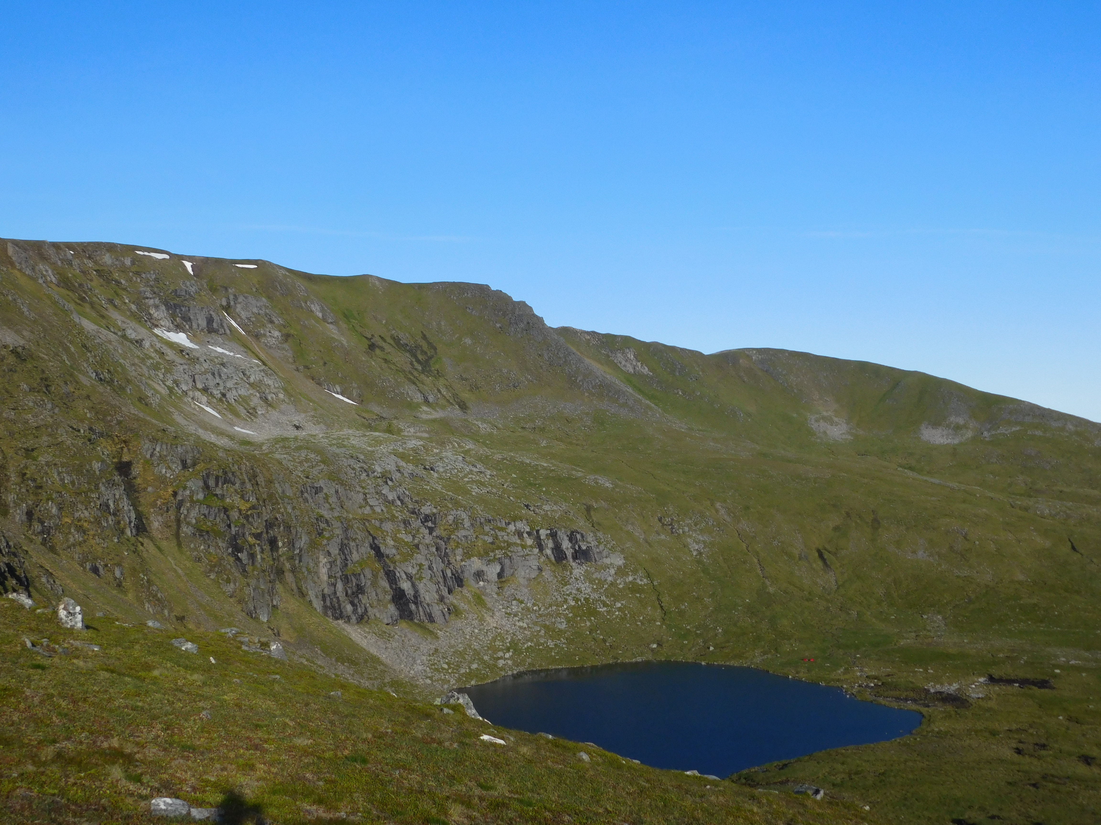 Lo bueno de ir con retraso era que iba a poder disfrutar de las magníficas vistas, y caminar con mayor seguridad que yendo a oscuras. El sendero de la cresta es estrecho y rocoso, y aun siendo bastante seguro va pegado a unos desplomes vertiginosos por la izquierda. Doscientos metros más abajo, al pie de las paredes casi verticales, un diminuto lago glaciar. Durante el descenso, además, también hay exposición fuerte por el lado derecho, lo que obliga a prestar atención. Una vez en el collado, a unos 980 m, la cumbre del Aonach Beag (1116 m) parece literalmente estar encima de mí. El camino trepa empinadísimo y expuesto. Me lo tomo con calma y pie firme, ya me siento mucho mejor. Afortunadamente la subida es tan dura como breve, y en el último tramo ya menos vertiginosa. Es así que hacia las cinco y veinte alcanzo el segundo pico de la cresta y cuarto Munro del día. Tras unos breves minutos para comer algo y disfrutar del paisaje continúo hacia el Geal Charn (1132 m), el monte más alto del día. La bajada tiene una buena inclinación y de nuevo discurre con precipicios a la izquierda, pero la cresta se ha vuelto más ancha e impone menos. Enseguida alcanzo el collado a 1017 m, y a partir de aquí emprendo una ascensión algo más larga y con rampas menos duras. Al final se alcanza un plateau herboso, por donde discurren los últimos metros hasta el pequeño cairn cimero, a donde llego a las seis y cuarto. Este es el segundo pico más alto del macizo del Ben Alder, sólo 16 metros más bajo que el que da nombre al macizo, y que aparece imponente al SE, al otro lado del Bealach Dubh.