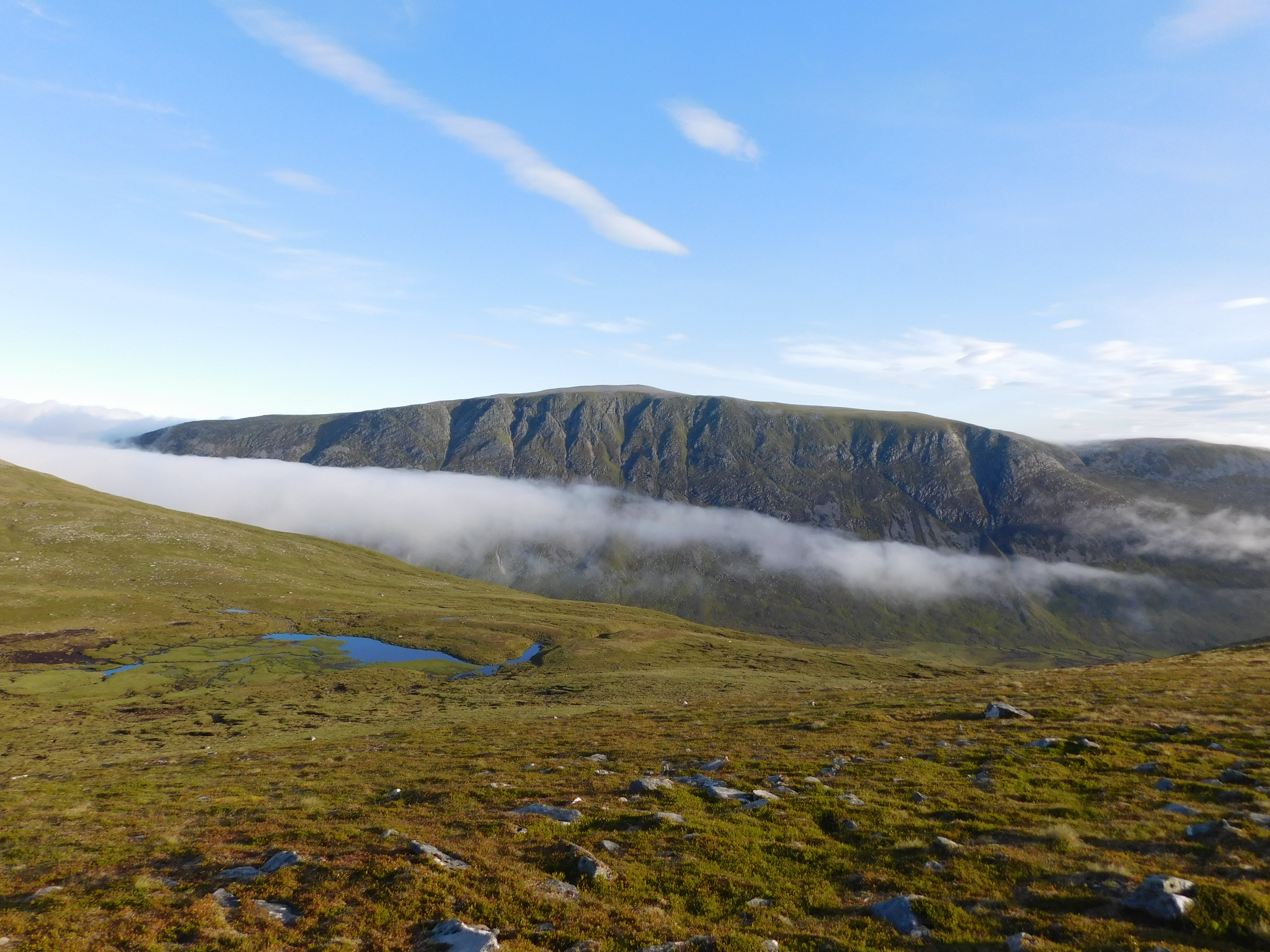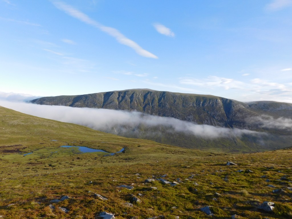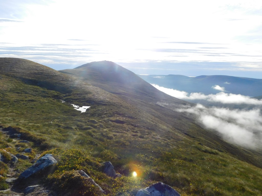 El descenso de esta montaña lo disfruté mucho. El día era espléndido, la temperatura tibia, las nieblas de los valles iban deshaciéndose y las vistas en todas direcciones magníficas. Comienza suavemente, en dirección ENE, atravesando el plateau durante casi dos kiómetros. Una vez alcanzado el zócalo rocoso que lo delimita, hay que destreparlo, el senderillo serpentea evitando los obstáculos principales (paso de Aisre Ghobhainn) y alcanza un colladito al pie de un resalte (Diollaid a’Chairn). Desde aquí las panorámicas son estupendas, con hermosos lagos a ambos lados de la cresta y el Ben Alder en el horizonte. Son las seis y media y decido tomar unas pocas fotos.