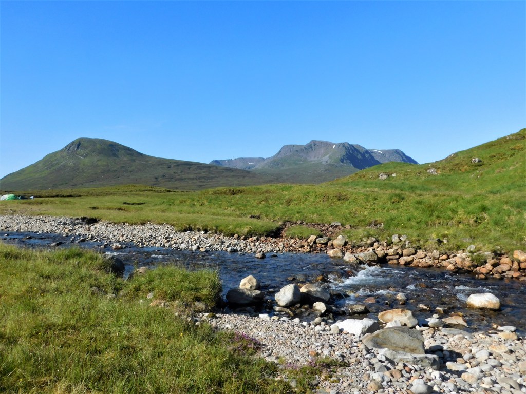 A partir de aquí el camino discurre sin sobresaltos por una cresta ancha y herbosa, superando primero la breve tachuela del Diollaid a’Chairn, descendiendo a un nuevo colladito y desde aquí, por pendientes muy llevaderas, alcanzo el cairn cimero del Carn Dearg (1034) hacia las siete y diez de la mañana. A mi derecha la caída hacia el valle del caudaloso río Allt a’Chaoil-reidhe es vertiginosa, pero es ahí que tengo que bajar. Inicio el descenso continuando por la cresta poco más de medio kilómetro, hasta que llego a la vertical del refugio (bothy) de Culra, hacia donde tengo que dejarme caer. Localizo una traza de sendero y me lanzo cuesta abajo por la pendiente. Agradezco que la hierba no se encuentre mojada, ya que prácticamente se podría bajar «esquiando» sobre las propias botas. A medio descenso la inclinación aumenta ulteriormente, y aquí diviso al primer montañero de la jornada, que sube penosamente siguiendo una trayectoria a escasos metros de la mía. Le saludo y prosigo hasta llegar al valle, pasando justo por detrás del bothy. Este refugio se encuentra, en teoría, clausurado por presencia de asbestos, y me llamó la atención ver algunas personas que se encontraban dentro. En sus inmediaciones y a lo largo del río se disponían numerosas tiendas cuyos ocupantes estaban atareados preparando el desayuno. Estas aguas excelentes, filtradas por la rota granítica y la turba, son potables tal cual. Era reconfortante poder por fin saludar y sonreír a seres humanos después de tantas horas de soledad. Culra, punto de partida para los ascensos a todos los picos del macizo, es un lugar de acampada de lo más agradable, aunque cuando visité el Ben Alder me metí otra gran kilometrada, ida y vuelta ligera desde Dalwhinnie, y no pernocté aquí. Ahora debía seguir de vuelta este camino, ya conocido. Eran las ocho pasadas y no había tiempo que perder; aún me restaban dieciséis kilómetros a recorrer en tres horas. Por tanto, tras una breve pausa para comer y beber algo, tomé el excelente sendero que sigue paralelo al río, por su orilla derecha, en dirección al Loch Pattack unos tres kilómetros aguas abajo. El paraje era hermoso, había que inmortalizarlo…