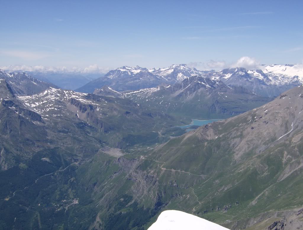 Hacia el Oeste vemos el paso de MontCenis, con su lago, y al fondo, los glaciares de la Vanoise.