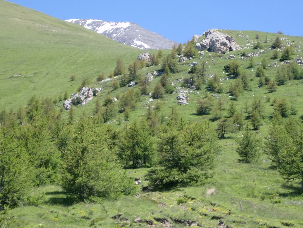 Son las 11 de la mañana. Empiezo a subir una fuerte pendiente, entre prados con algunos pinos aislados.