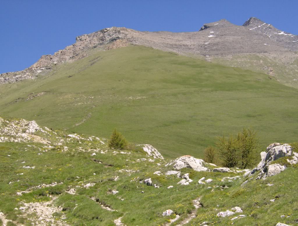 Tras un breve descanso y un trago de agua, echo una ojeada a lo que me queda. El camino se mete en la pedrera, primero va todo hacia la derecha, traza un zigzag para volver hacia el collado a la izquierda de la antecima y allí vuelve a girar a la derecha, para alcanzar primero la antecima, también llamada La Crocetta por esta cruz de hierro.