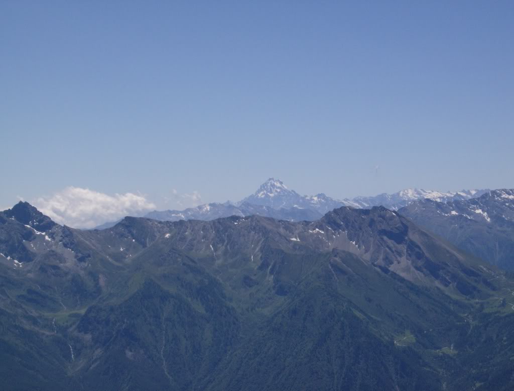 Y bajando más hacia el sur distinguimos el macizo de Ecrins, con el Pelvoux (izqda.) y la trapezoidal Barre des Ecrins destacada.