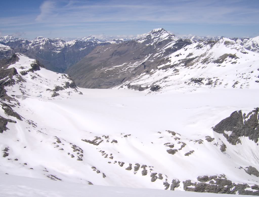 Ahora miremos a nuestro alrededor. Hemos subido por la cara Sur, limpia de nieve. Sin embargo, la cara Norte está ocupada por un glaciar, que en esta época del año aún luce esplendoroso.