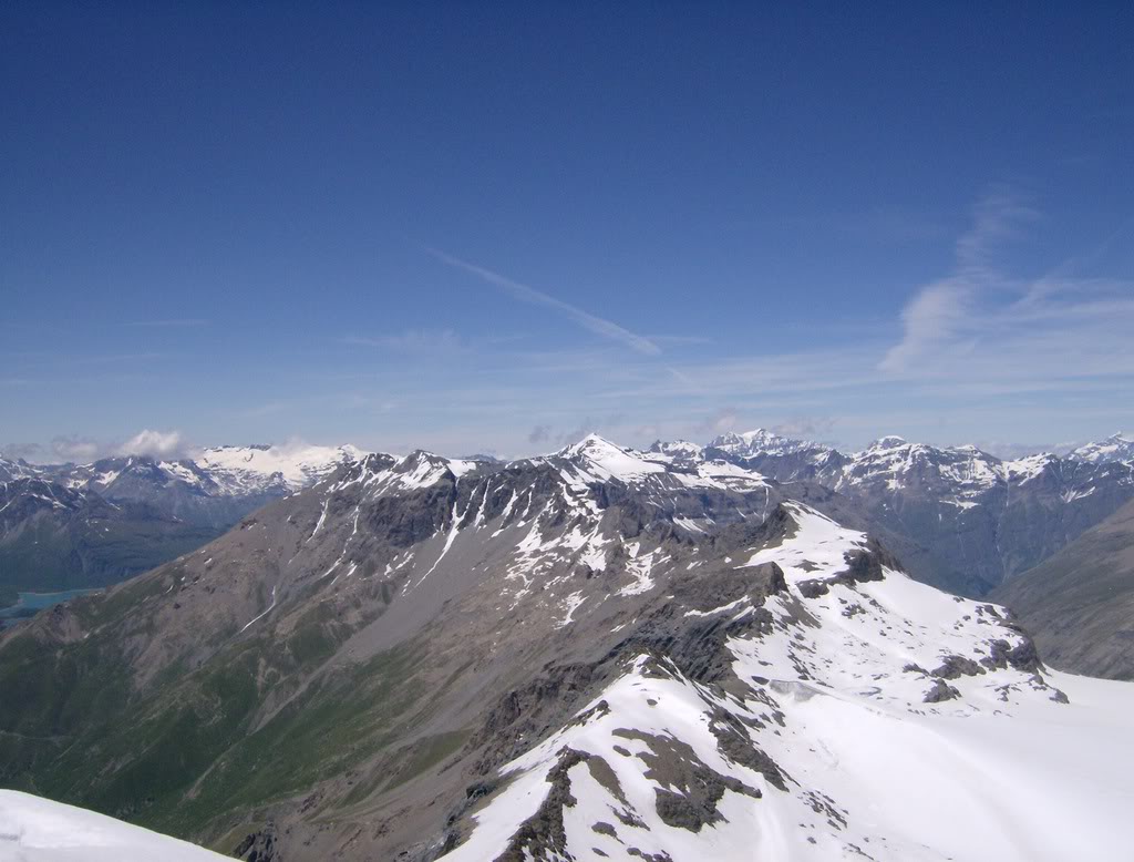 Hacia el Oeste vemos el paso de MontCenis, con su lago, y al fondo, los glaciares de la Vanoise.
