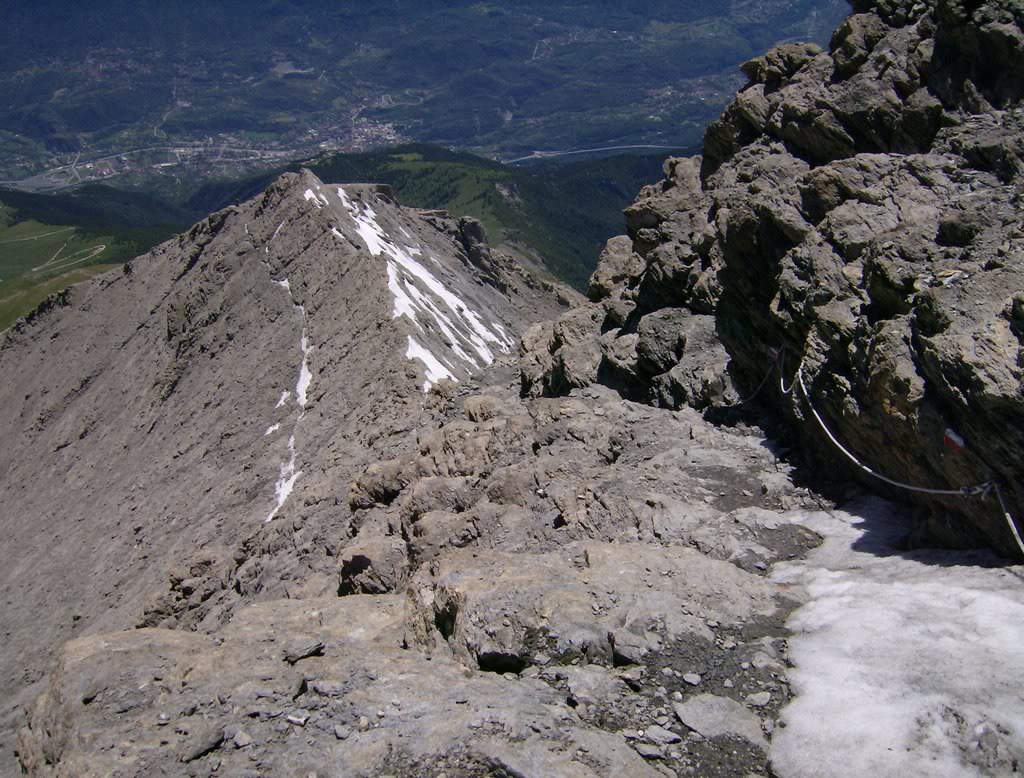 Sólo quedan 200 m de desnivel hasta la cumbre. Ahora el camino se introduce por la vertiginosa cara Este, subiendo en zigzag hacia la cumbre.