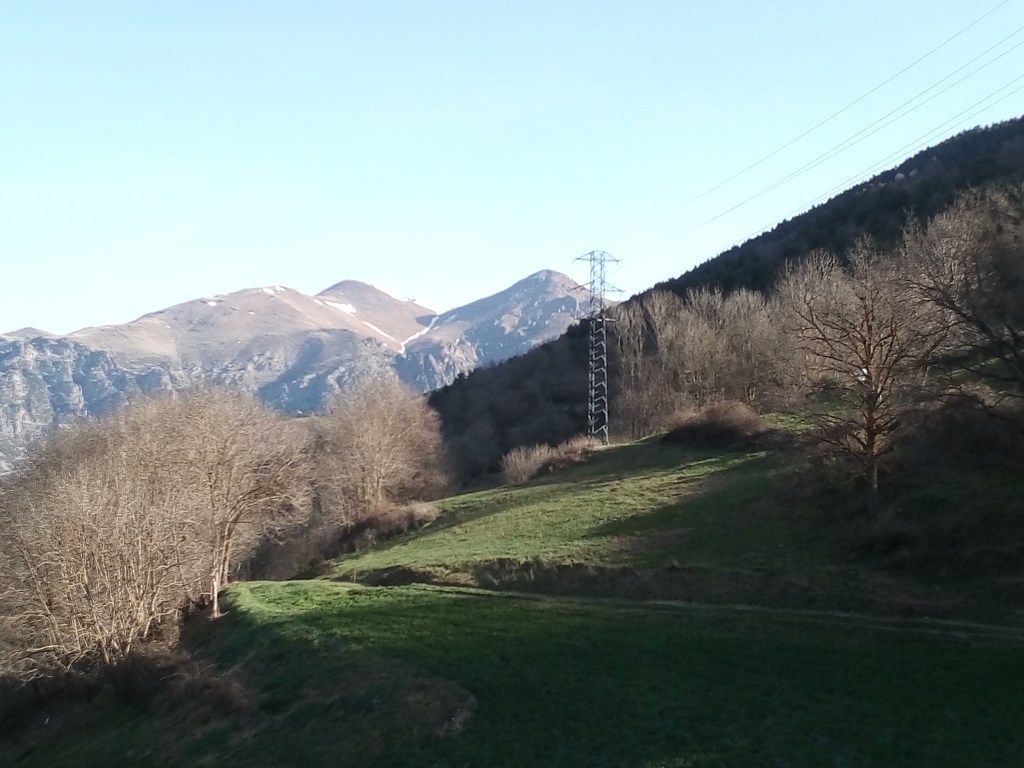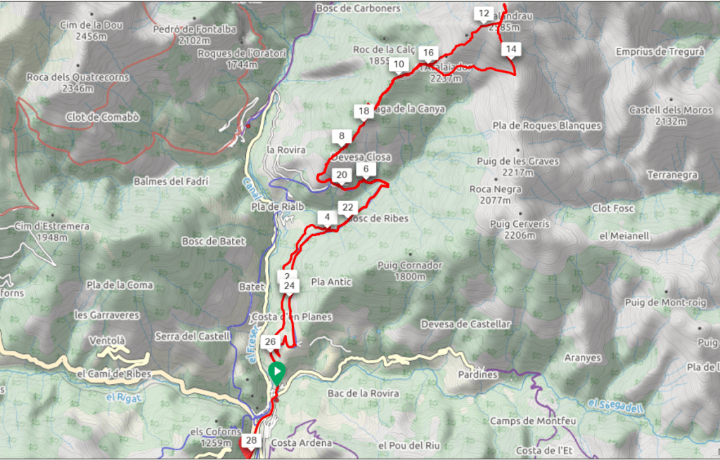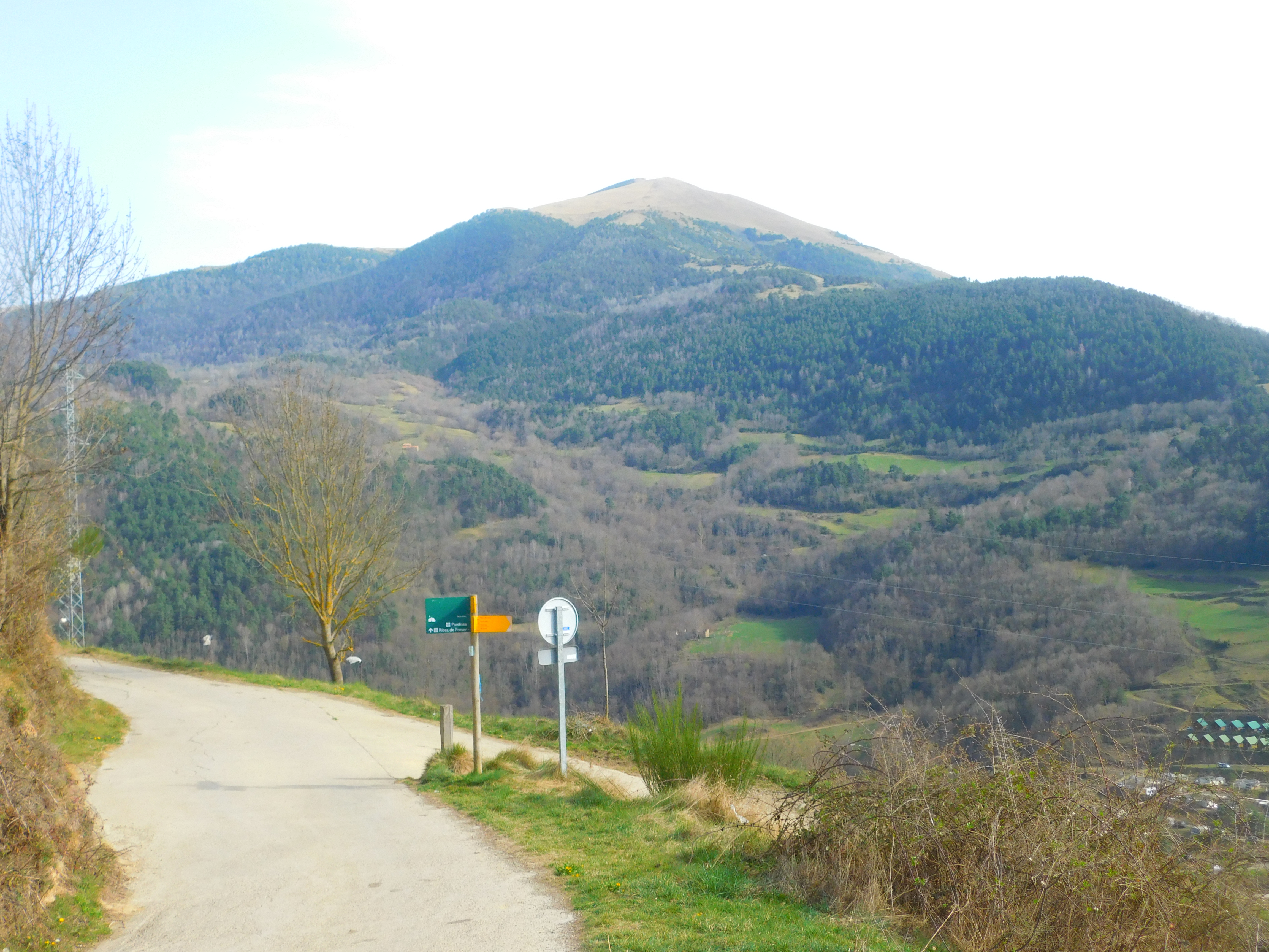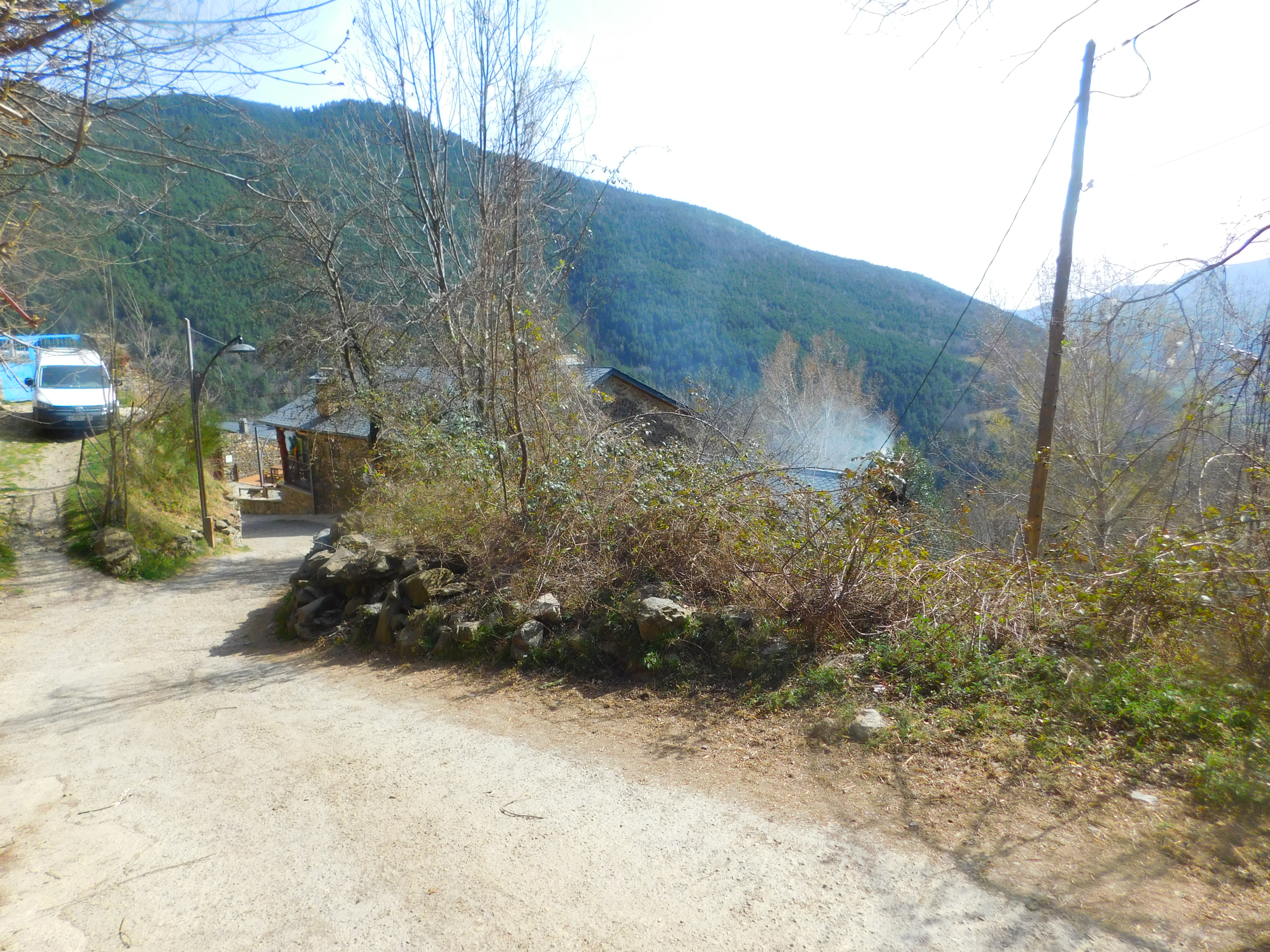 La cinta de asfalto prosigue superando el cementerio y un hotel-spa para llegar en menos de un kilometro a la granja de Ventaiola. Aquí la pista principal sube decidida por la ladera derecha en zigzags buscando la localidad de Ribesaltes. Volvería por aquí unas horas más tarde, y a la postre encontré la variante de regreso preferible a la de ida, aun siendo ligeramente más larga. Iba siguiendo en mi GPS una traza de wikiloc, que me condujo por una rodada que proseguía recta por el prado. Este es el «Camino de las Centrales», en referencia a las viejas instalaciones hidroeléctricas que salpican esta zona del valle de Freser. Se encuentra bien señalizado, no hay pérdida.