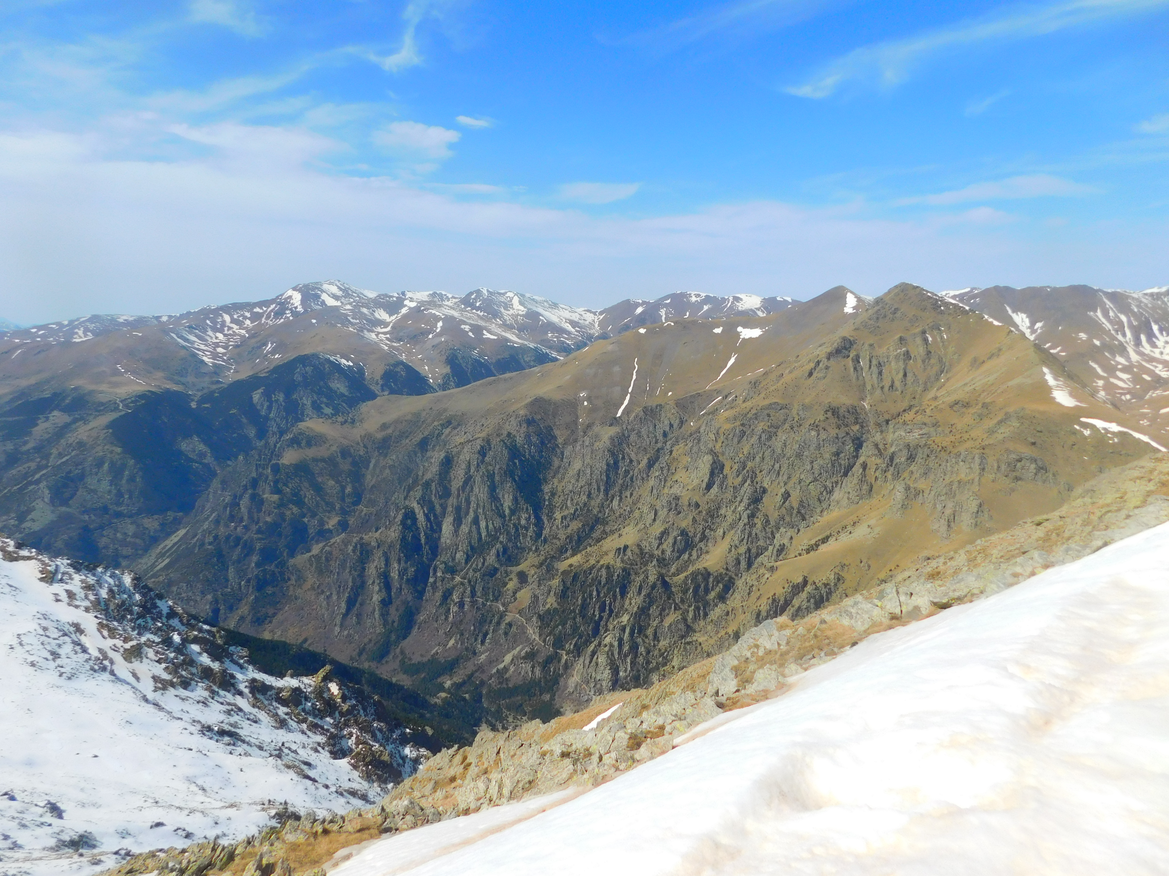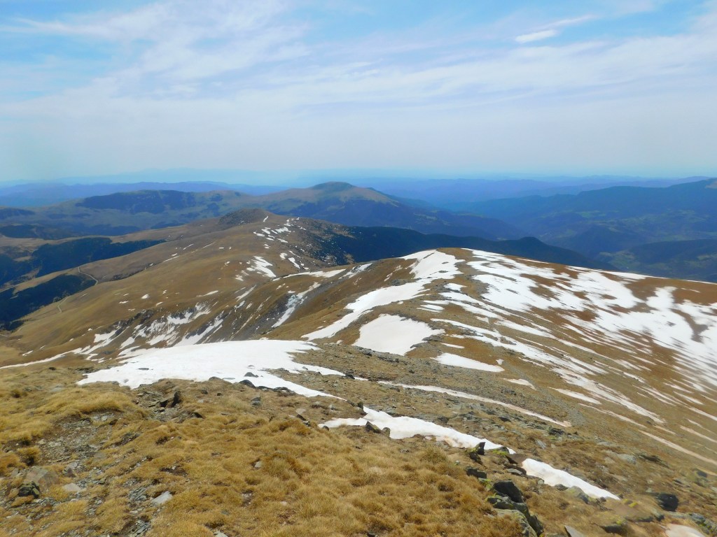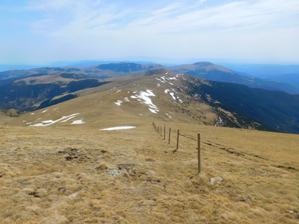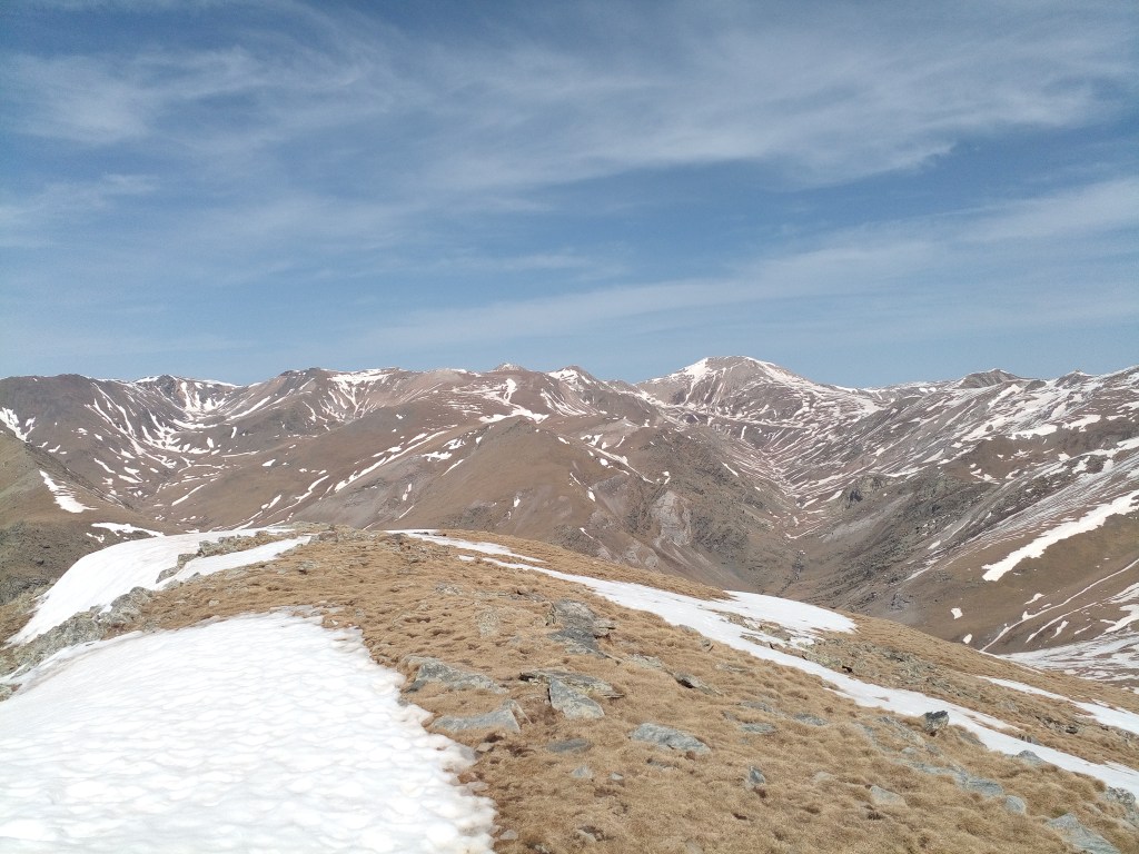 El panorama es soberbio, como esperaba, y el día perfecto para gozar de las vistas. A mis pies, hacia el noreste, el coll de Trespics, a partir del cual se eleva en dirección norte el cordal de Catllar hasta el Gra de Fajol, encima de Vallter 2000, delimitando el valle del recién nacido río Freser. Al fondo, dominando el panorama y sobre la línea fronteriza, el Bastiments (2881 m) domina el panorama. A su izquierda, la cadena axial de los Pirineos prosigue con Pic de l’Infern, Noucreus, Noufonts… todos por encima de los 2700 m.