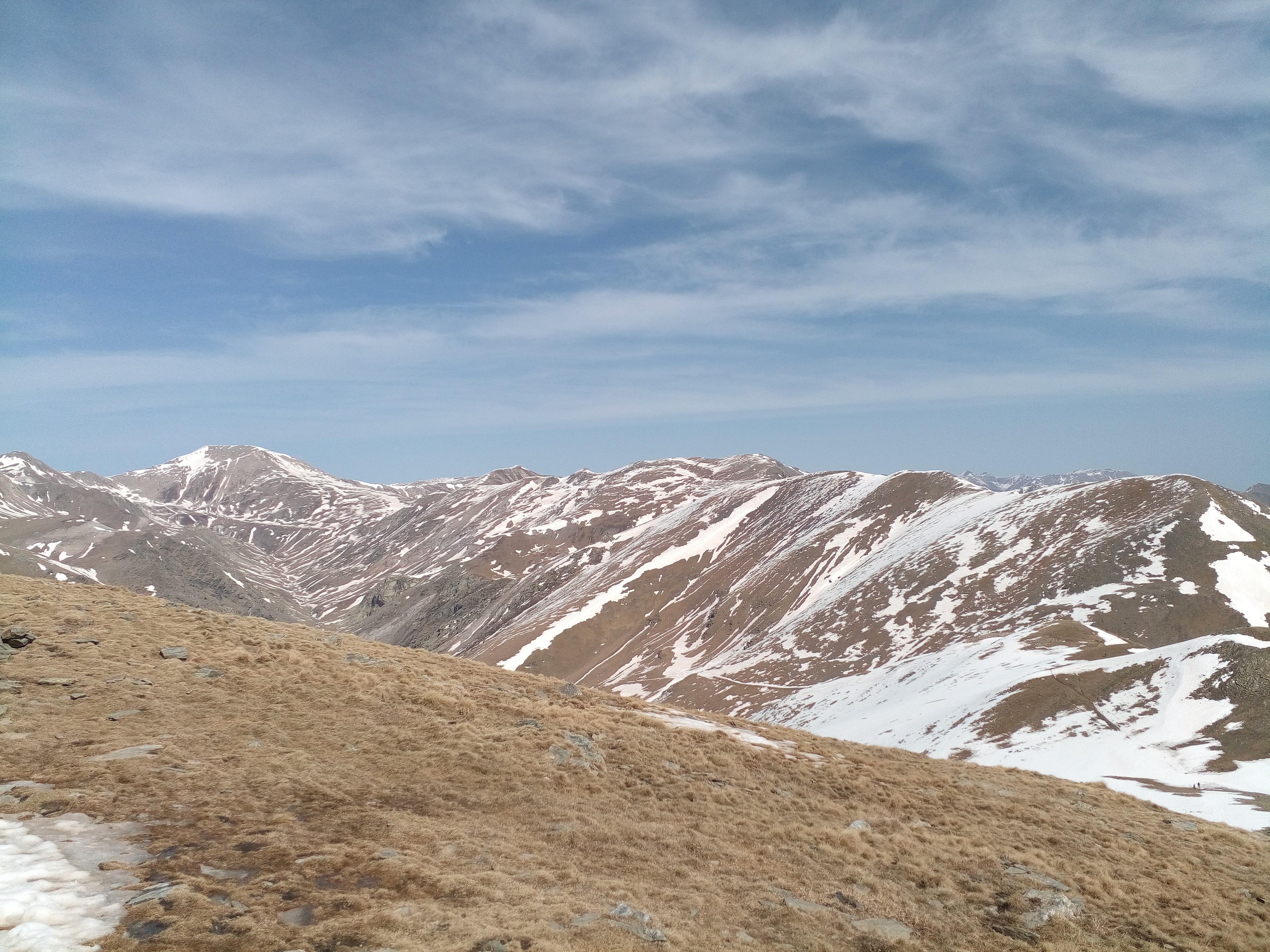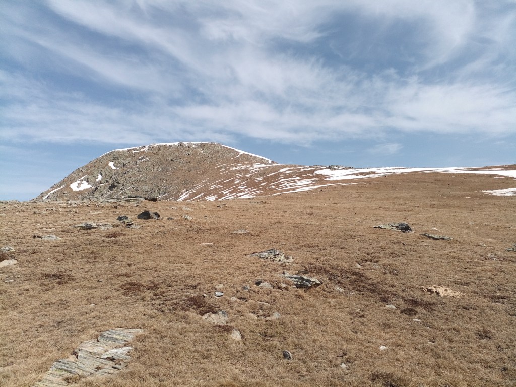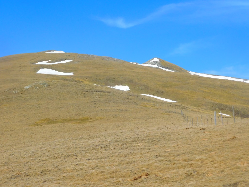 Según me acerco al contrafuerte rocoso del Atalaiador, me cruzo con un grupo de montañeros que vienen bajando. Más arriba el sendero prácticamente desaparece pero se progresa con bastante comodidad por la pendiente herbosa. Resoplo, debo detenerme cada pocos minutos. El siguiente punto de referencia son las Rocas Blancas, a 2400 m y en la misma falda del Balandrau. Las dejo a mi izquierda, siguiendo ocasionales hitos y trazas. Mi avance se vuelve penoso. Finalmente la pendiente cede y alcanzo un área horizontal cubierta por un nevero de cierta amplitud. Atravesarlo es trivial, pero mientras lo hago la reverberación de la luz y el calor ambiental hacen que empiece a sentir mi cabeza «ligera». Estoy tranquilo porque no hay rastro de problemas estomacales y no puede ser mal de altura… Probablemente es el efecto del calor durante la primera excursión primaveral, cuando el cuerpo aún sigue «programado» para los fríos del invierno. La cima ahora sí estaba la alcance de la mano.