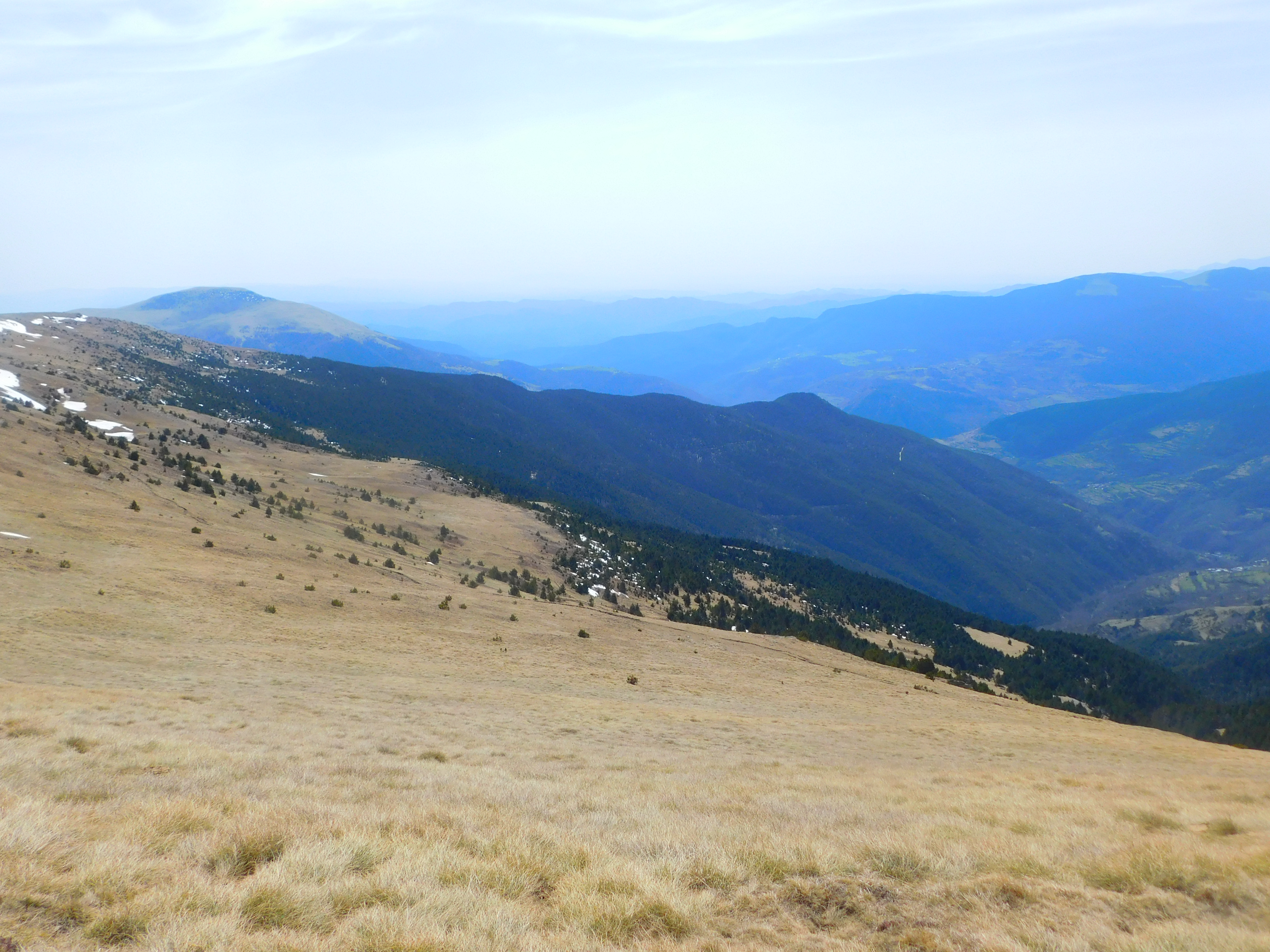 A las dos y diez emprendo la vuelta. Vuelvo dobre mis pasos hasta el colladito que antecede la cumbre y aquí, en vez de girar a la derecha para bajar directo por donde había llegado, prosigo recto por la herbosa cresta sur, la Serra de la Canya con el Puig Cerveris al otro extremo y más allá, al fondo, el Taga, viejo conocido.