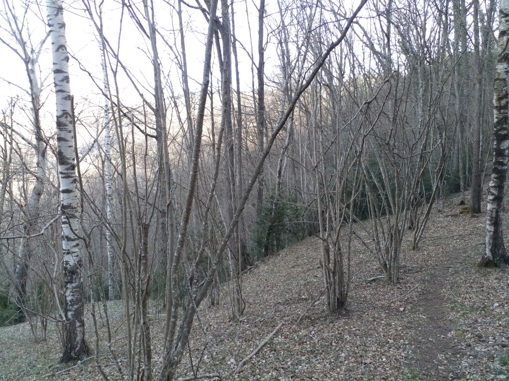 El amplio camino atraviesa el prado, se va ciñendo a la ladera y al cabo de pocos minutos el GPS me indica que me estoy desviando. Retrocedo unos pocos metros y reparo en una traza secundaria que arranca en subida a la derecha. El camino se adentra en el bosque, se vuelve más estrecho, embarrado, y a veces se medio difumina. Mi impresión es que se encuentra en desuso, sobre todo después del período de restricciones pandémicas.
